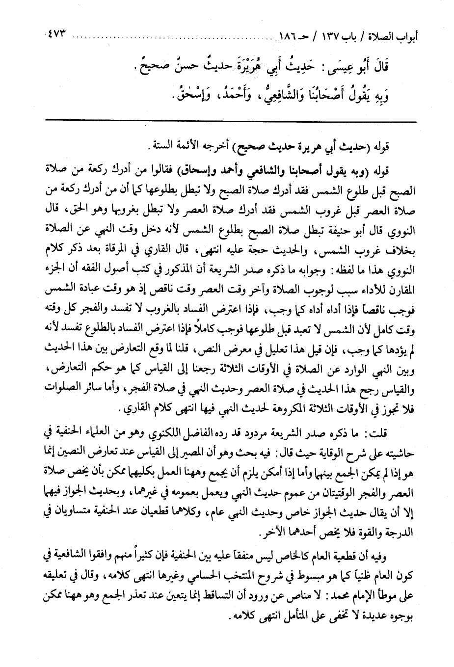 قُلْتُ مَا ذَكَرَهُ صَدْرُ الشَّرِيعَةِ مَرْدُودٌ قَدْ رَدَّهُ الْفَاضِلُ اللَّكْنَوِيُّ وَهُوَ مِنَ الْعُلَمَاءِ الْحَنَفِيَّةِ فِي حَاشِيَتِهِ عَلَى شَرْحِ الْوِقَايَةِ حَيْثُ قَالَ فِيهِ بَحْثٌ وَهُوَ أَنَّ الْمَصِيرَ إِلَى الْقِيَاسِ عِنْدَ تَعَارُضِ النَّصَّيْنِ إِنَّمَا هُوَ إِذَا لَمْ يُمْكِنِ الْجَمْعُ بَيْنَهُمَا وَأَمَّا إِذَا أَمْكَنَ يَلْزَمُ أن يجمع وها هنا الْعَمَلُ بِكِلَيْهِمَا مُمْكِنٌ بِأَنْ يُخَصَّ صَلَاةُ الْعَصْرِ وَالْفَجْرِ الْوَقْتِيَّتَانِ مِنْ عُمُومِ حَدِيثِ النَّهْيِ وَيُعْمَلَ بِعُمُومِهِ فِي غَيْرِهِمَا وَبِحَدِيثِ الْجَوَازِ فِيهِمَا إِلَّا أَنْ يُقَالَ حَدِيثُ الْجَوَازِ خَاصٌّ وَحَدِيثُ النَّهْيِ عَامٌّ وَكِلَاهُمَا قَطْعِيَّانِ عِنْدَ الْحَنَفِيَّةِ مُتَسَاوِيَانِ فِي الدَّرَجَةِ وَالْقُوَّةِ فَلَا يَخُصُّ أَحَدُهُمَا الْآخَرَ