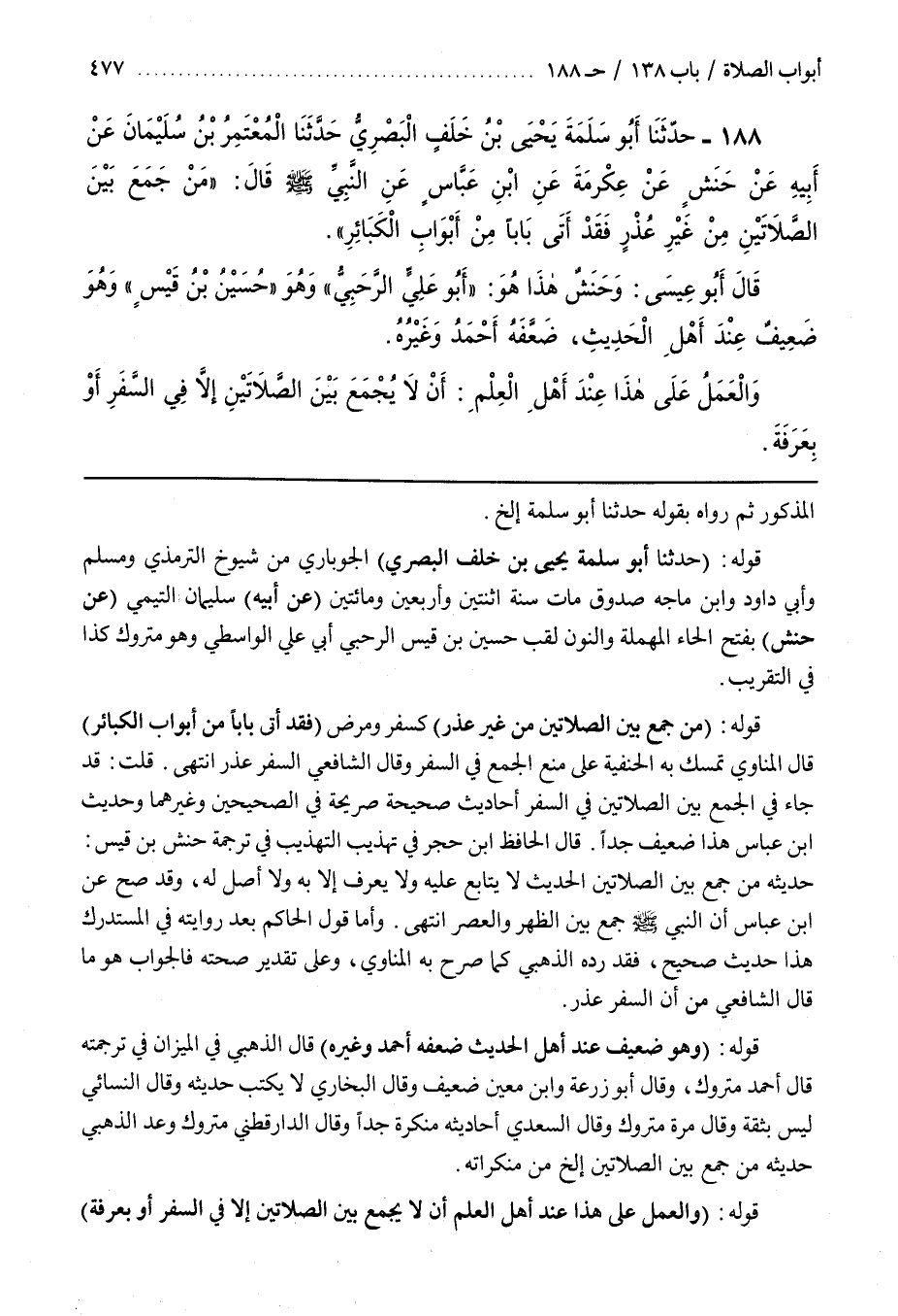 قال الحافظ بن حَجَرٍ فِي تَهْذِيبِ التَّهْذِيبِ فِي تَرْجَمَةِ حَنَشِ بْنِ قَيْسٍ حَدِيثُهُ مَنْ جَمَعَ بَيْنَ الصَّلَاتَيْنِ الْحَدِيثَ لَا يُتَابَعُ عَلَيْهِ وَلَا يُعْرَفُ إِلَّا بِهِ وَلَا أَصْلَ لَهُ وَقَدْ صَحَّ عَنِ بن عَبَّاسٍ أَنَّ النَّبِيَّ صَلَّى اللَّهُ عَلَيْهِ وَسَلَّمَ جَمَعَ بَيْنَ الظُّهْرِ وَالْعَصْرِ انْتَهَى