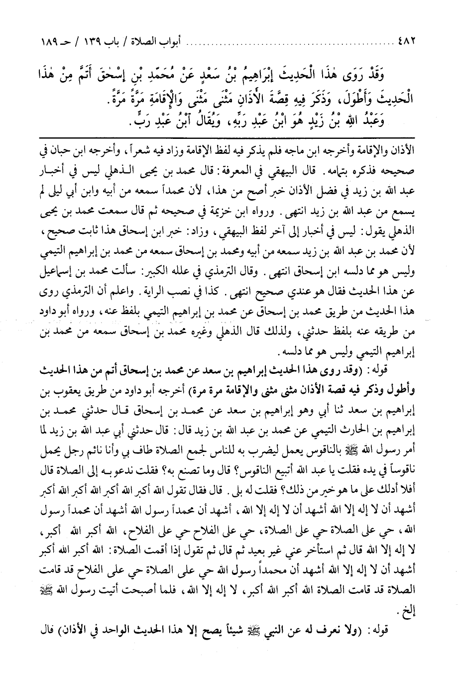 قَوْلُهُ (وَقَدْ رَوَى هَذَا الْحَدِيثَ إِبْرَاهِيمُ بْنُ سَعْدٍ عَنْ مُحَمَّدِ بْنِ إِسْحَاقَ أَتَمَّ مِنْ هَذَا الْحَدِيثِ وَأَطْوَلَ وَذَكَرَ فِيهِ قِصَّةَ الْأَذَانِ مَثْنَى مَثْنَى وَالْإِقَامَةِ مَرَّةً مَرَّةً) أَخْرَجَهُ أَبُو دَاوُدَ مِنْ طَرِيقِ يَعْقُوبَ بْنِ إِبْرَاهِيمَ بْنِ سَعْدٍ ثَنَا أَبِي وَهُوَ إِبْرَاهِيمُ بْنُ سَعْدٍ عَنْ مُحَمَّدِ بْنِ إِسْحَاقَ قَالَ حَدَّثَنِي مُحَمَّدُ بْنُ إِبْرَاهِيمَ بْنِ الْحَارِثِ التَّيْمِيُّ عَنْ مُحَمَّدِ بْنِ عَبْدِ اللَّهِ بْنِ زَيْدٍ قَالَ قَالَ حَدَّثَنِي أَبِي عَبْدُ اللَّهِ بْنُ زَيْدٍ لَمَّا أَمَرَ رَسُولُ اللَّهِ صَلَّى اللَّهُ عَلَيْهِ وَسَلَّمَ بِالنَّاقُوسِ يُعْمَلُ لِيُضْرَبَ بِهِ لِلنَّاسِ لِجَمْعِ الصَّلَاةِ طَافَ بِي وَأَنَا نَائِمٌ رَجُلٌ يَحْمِلُ نَاقُوسًا فِي يَدِهِ فَقُلْتُ يَا عَبْدَ اللَّهِ أَتَبِيعُ النَّاقُوسَ قَالَ وَمَا تَصْنَعُ بِهِ فَقُلْتُ نَدْعُو بِهِ إِلَى الصَّلَاةِ قَالَ أَفَلَا أَدُلُّكَ عَلَى مَا هُوَ خَيْرٌ مِنْ ذَلِكَ فَقُلْتُ لَهُ بَلَى