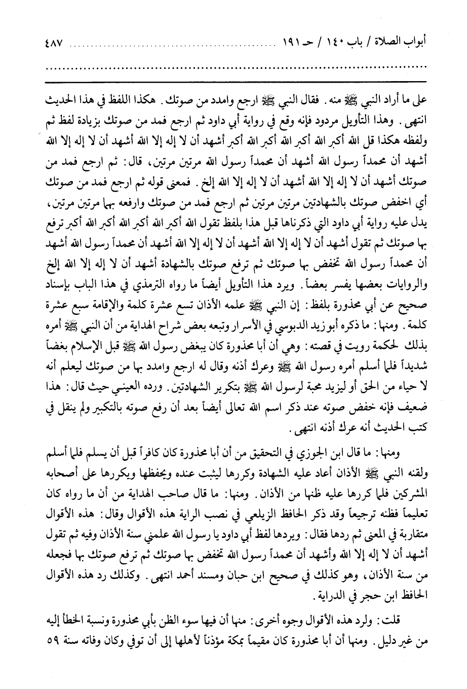 ومنها ما قال بن الْجَوْزِيِّ فِي التَّحْقِيقِ مِنْ أَنَّ أَبَا مَحْذُورَةَ كَانَ كَافِرًا قَبْلَ أَنْ يُسْلِمَ فَلَمَّا أَسْلَمَ وَلَقَّنَهُ النَّبِيُّ صَلَّى اللَّهُ عَلَيْهِ وَسَلَّمَ الْأَذَانَ أعاد عليه الشهادة وكررها ليثبت عِنْدَهُ وَيَحْفَظَهَا وَيُكَرِّرَهَا عَلَى أَصْحَابِهِ الْمُشْرِكِينَ فَلَمَّا كَرَّرَهَا عَلَيْهِ ظَنَّهَا مِنَ الْأَذَانِ