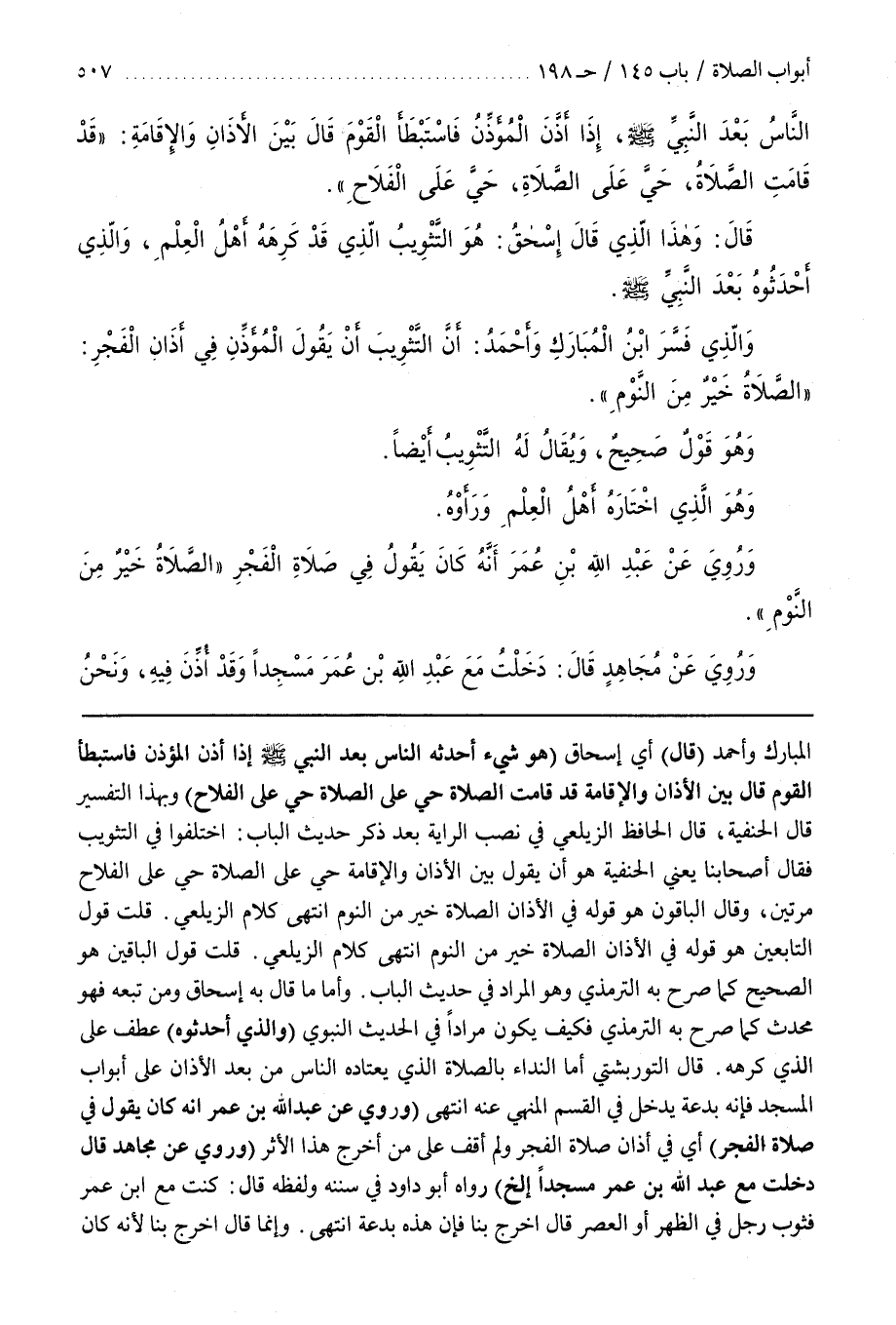 الْمُبَارَكِ وَأَحْمَدُ (قَالَ) أَيْ إِسْحَاقُ (هُوَ شَيْءٌ أَحْدَثَهُ النَّاسُ بَعْدَ النَّبِيِّ صَلَّى اللَّهُ عَلَيْهِ وَسَلَّمَ إِذَا أَذَّنَ الْمُؤَذِّنُ فَاسْتَبْطَأَ الْقَوْمُ قَالَ بَيْنَ الْأَذَانِ وَالْإِقَامَةِ قَدْ قَامَتِ الصَّلَاةُ حَيَّ عَلَى الصَّلَاةِ حَيَّ عَلَى الْفَلَاحِ) وَبِهَذَا التَّفْسِيرِ قَالَ الْحَنَفِيَّةُ قَالَ الْحَافِظُ الزَّيْلَعِيُّ فِي نَصْبِ الرَّايَةِ بَعْدَ ذِكْرِ حَدِيثِ الْبَابِ اخْتَلَفُوا فِي التَّثْوِيبِ فَقَالَ أَصْحَابُنَا يَعْنِي الْحَنَفِيَّةَ هُوَ أَنْ يَقُولَ بَيْنَ الْأَذَانِ وَالْإِقَامَةِ حَيَّ عَلَى الصَّلَاةِ حَيَّ عَلَى الْفَلَاحِ مَرَّتَيْنِ وَقَالَ الْبَاقُونَ هُوَ قَوْلُهُ فِي الْأَذَانِ الصَّلَاةُ خَيْرٌ مِنَ النَّوْمِ انْتَهَى كَلَامُ الزَّيْلَعِيِّ