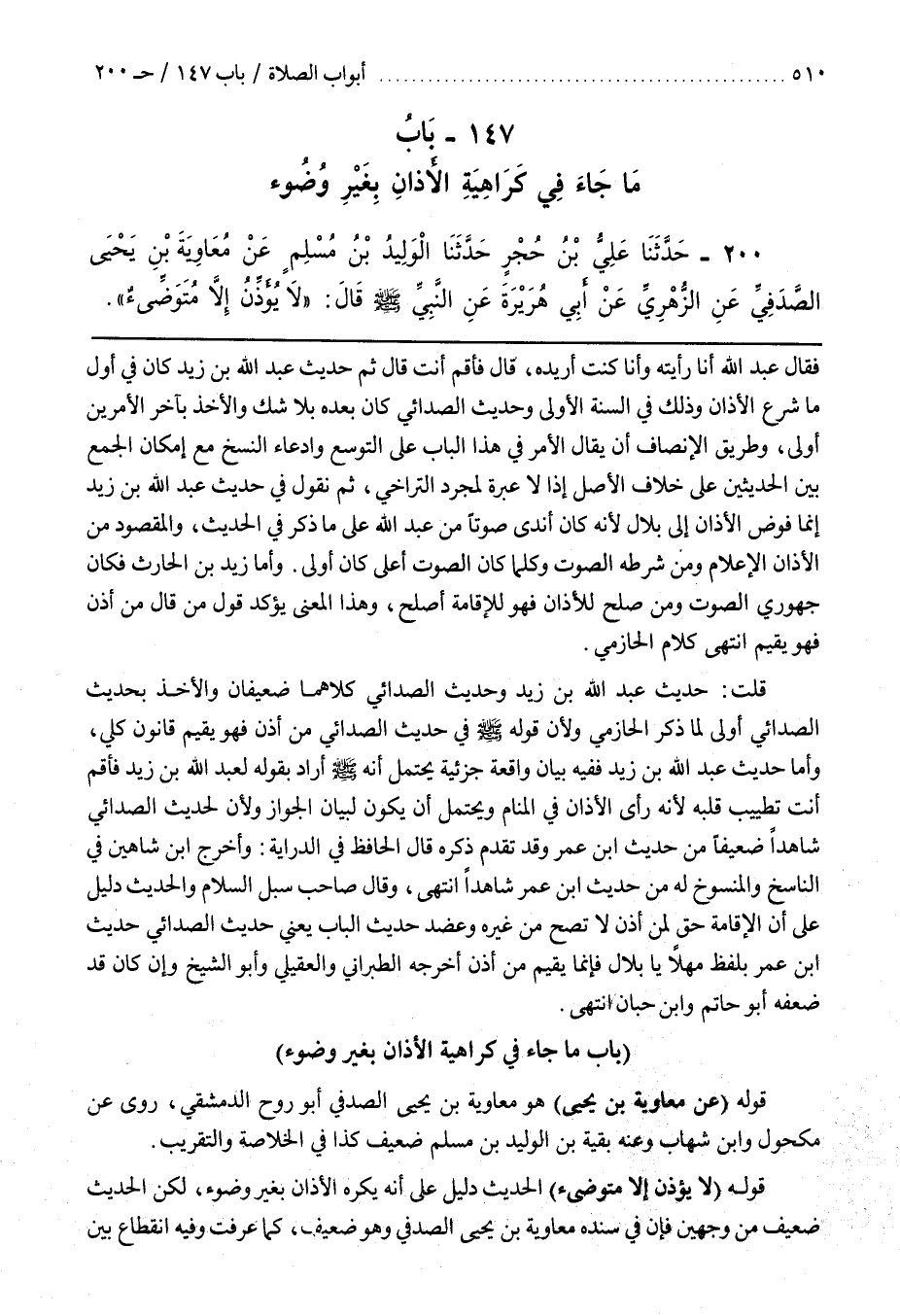 وقوله (لَا يُؤَذِّنُ إِلَّا مُتَوَضِّئٌ) الْحَدِيثُ دَلِيلٌ عَلَى أَنَّهُ يُكْرَهُ الْأَذَانُ بِغَيْرِ وُضُوءٍ لَكِنَّ الْحَدِيثَ ضَعِيفٌ مِنْ وَجْهَيْنِ فَإِنَّ فِي سَنَدِهِ مُعَاوِيَةَ بْنَ يَحْيَى الصَّدَفِيَّ وَهُوَ ضَعِيفٌ كَمَا عَرَفْتَ فيه انقطاع بين