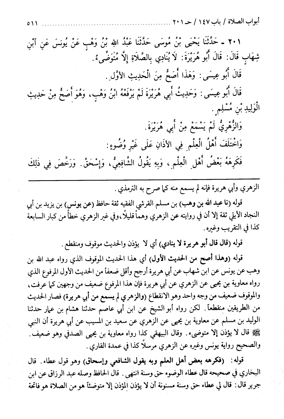 الزُّهْرِيِّ وَأَبِي هُرَيْرَةَ فَإِنَّهُ لَمْ يَسْمَعْ مِنْهُ كَمَا صَرَّحَ بِهِ التِّرْمِذِيُّ