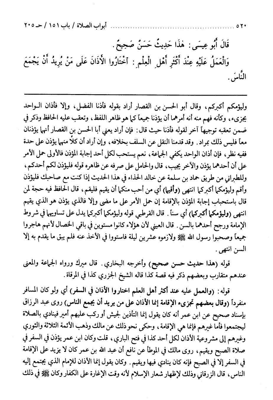 وَلْيَؤُمَّكُمْ أَكْبَرُكُمْ وَمُرَادُهُ بِحَدِيثِ الْبَابِ حَدِيثُ مَالِكِ بْنِ الْحُوَيْرِثِ بِلَفْظِ أَتَيْتُ النَّبِيَّ صَلَّى اللَّهُ عَلَيْهِ وَسَلَّمَ فِي نَفَرٍ مِنْ قَوْمِي الْحَدِيثَ وَفِي آخِرِهِ فَإِذَا حَضَرَتِ الصَّلَاةُ فَلْيُؤَذِّنْ لَكُمْ أَحَدُكُمْ وَلْيَؤُمَّكُمْ أَكْبَرُكُمْ وَقَالَ أَبُو الْحَسَنِ بْنُ الْقَصَّارِ أَرَادَ بِقَوْلِهِ فَأَذِّنَا الْفَضْلَ وَإِلَّا فَأَذَانُ الْوَاحِدِ يُجْزِئُ وَكَأَنَّهُ فَهِمَ مِنْهُ أَنَّهُ أَمَرَهُمَا أَنْ يُؤَذِّنَا جَمِيعًا كَمَا هُوَ ظَاهِرُ اللَّفْظِ وَتَعَقَّبَ عَلَيْهِ الْحَافِظُ وَذَكَرَ فِي ضِمْنِ تَعَقُّبِهِ تَوْجِيهًا آخَرَ لِقَوْلِهِ فَأَذِّنَا حَيْثُ قَالَ فَإِنْ أَرَادَ يَعْنِي أَبَا الْحَسَنِ بْنَ الْقَصَّارِ أَنَّهُمَا يُؤَذِّنَانِ مَعًا فَلَيْسَ ذَلِكَ بِمُرَادٍ
