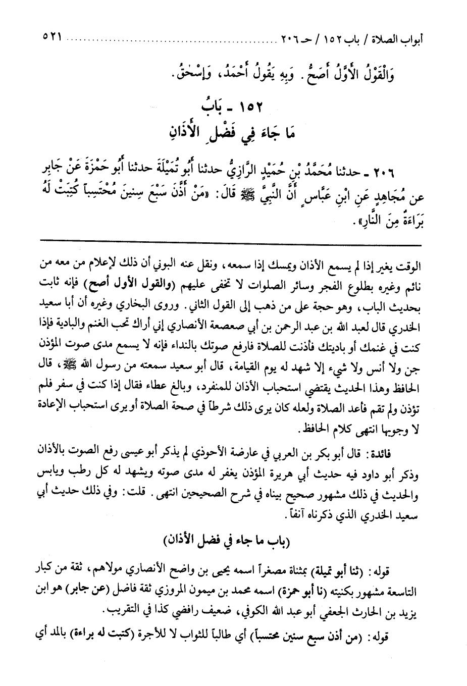 فَائِدَةٌ قَالَ أَبُو بَكْرِ بْنُ الْعَرَبِيِّ فِي عَارِضَةِ الْأَحْوَذِيِّ لَمْ يَذْكُرْ أَبُو عِيسَى رَفْعَ الصَّوْتِ بِالْأَذَانِ وَذَكَرَ أَبُو دَاوُدَ فِيهِ حَدِيثَ أَبِي هُرَيْرَةَ الْمُؤَذِّنُ يُغْفَرُ لَهُ مَدَى صَوْتِهِ وَيَشْهَدُ لَهُ كُلُّ رَطْبٍ وَيَابِسٍ وَالْحَدِيثُ فِي ذَلِكَ مَشْهُورٌ صَحِيحٌ بَيَّنَّاهُ فِي شَرْحِ الصَّحِيحَيْنِ انْتَهَى