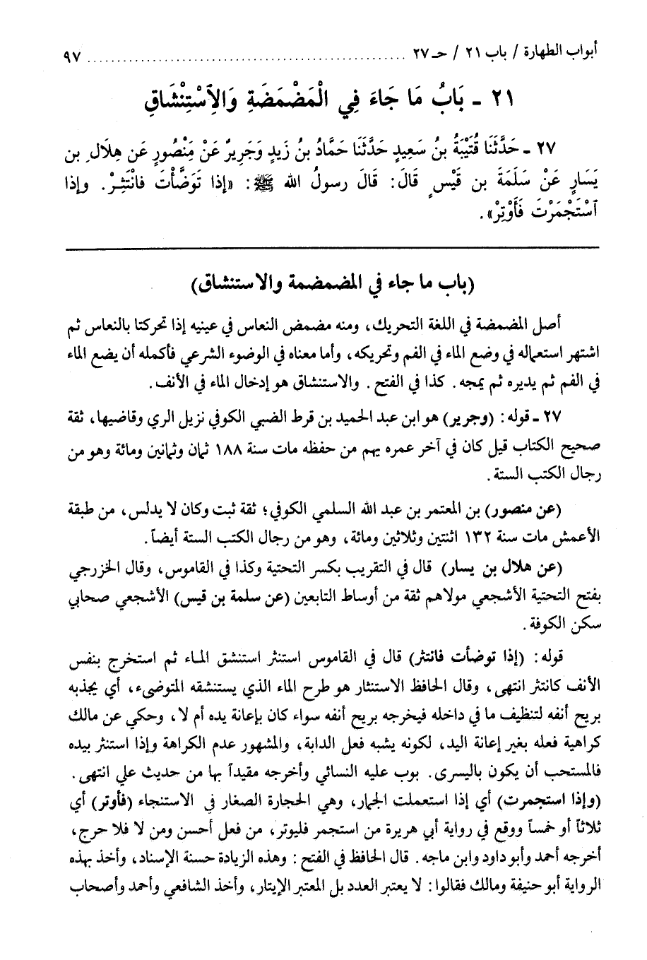 وَالِاسْتِنْشَاقُ هُوَ إِدْخَالُ الماء في الأنف [27] قوله (وجرير) هو بن عبد الحميد بن قرط الضبي الكوفي نزيل الري وقاضيها ثقة صحيح الكتاب قيل كان فِي آخِرِ عُمُرِهِ يَهِمُ مِنْ حِفْظِهِ مَاتَ سَنَةَ 188 ثَمَانٍ وَثَمَانِينَ وَمِائَةٍ وَهُوَ مِنْ رِجَالِ الكتب الستة