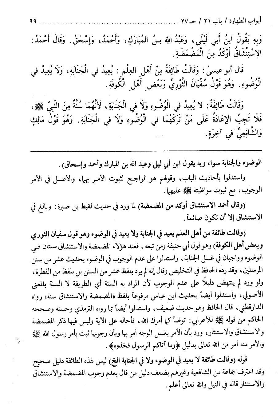 الوضوء والجنابة سواء وبه يقول بن أَبِي لَيْلَى وَعَبْدُ اللَّهِ بْنُ الْمُبَارَكِ وَأَحْمَدُ وَإِسْحَاقُ)