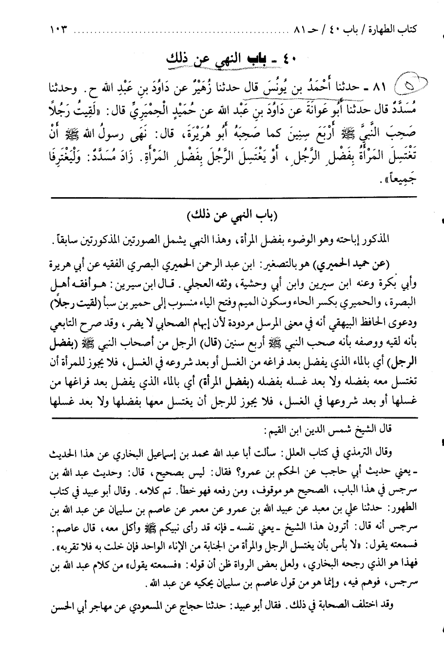 قال بن سِيرِينَ هُوَ أَفْقَهُ أَهْلِ الْبَصْرَةِ وَالْحِمْيَرُ بِكَسْرِ الْحَاءِ وَسُكُونِ الْمِيمِ وَفَتْحِ الْيَاءِ مَنْسُوبٌ إِلَى حِمْيَرَ بْنِ سَبَأٍ (لَقِيتُ رَجُلًا) وَدَعْوَى الْحَافِظِ الْبَيْهَقِيِّ أَنَّهُ فِي مَعْنَى الْمُرْسَلِ مَرْدُودَةٌ لِأَنَّ إِبْهَامَ الصَّحَابِيِّ لَا يَضُرُّ وَقَدْ صَرَّحَ التَّابِعِيُّ بِأَنَّهُ لَقِيَهُ وَوَصَفَهُ بِأَنَّهُ صَحِبَ النَّبِيَّ صَلَّى اللَّهُ عَلَيْهِ وَسَلَّمَ أَرْبَعَ سِنِينَ (قَالَ) الرَّجُلُ مِنْ أَصْحَابِ النَّبِيِّ صَلَّى اللَّهُ عَلَيْهِ وَسَلَّمَ (بِفَضْلِ الرَّجُلِ) أَيْ بِالْمَاءِ الَّذِي يَفْضُلُ بَعْدَ فَرَاغِهِ مِنَ الْغُسْلِ أَوْ بَعْدَ شُرُوعِهِ فِي الْغُسْلِ فَلَا يَجُوزُ لِلْمَرْأَةِ أَنْ تَغْتَسِلَ مَعَهُ بِفَضْلِهِ وَلَا بَعْدَ غُسْلِهِ بِفَضْلِهِ (بِفَضْلِ الْمَرْأَةِ) أَيْ بِالْمَاءِ الَّذِي يَفْضُلُ بَعْدَ فَرَاغِهَا مِنْ غُسْلِهَا أَوْ بَعْدَ شُرُوعِهَا فِي الْغُسْلِ فَلَا يَجُوزُ لِلرَّجُلِ أَنْ يَغْتَسِلَ مَعَهَا بِفَضْلِهَا وَلَا بعد غسلها