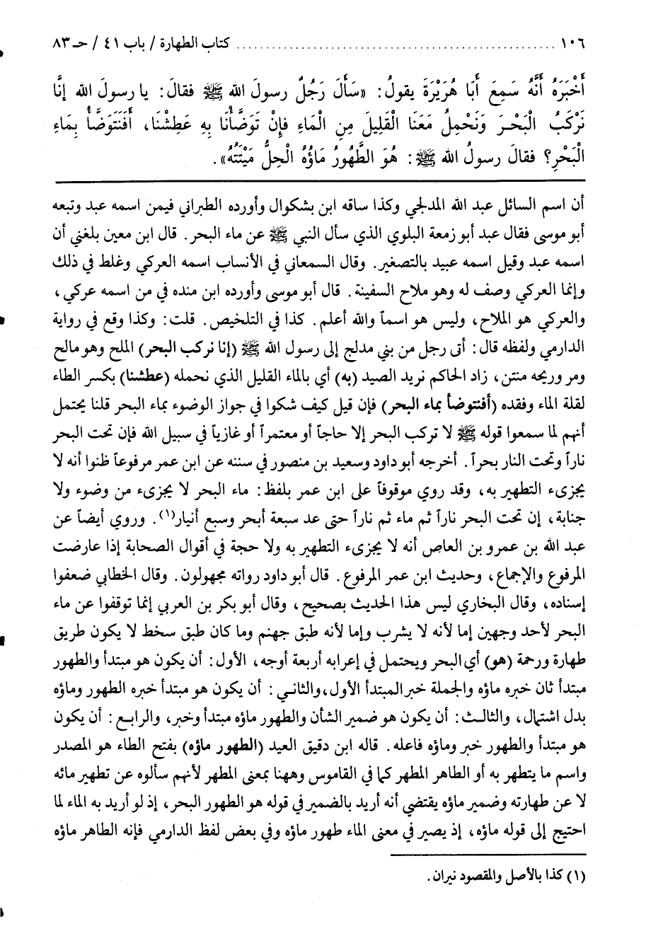 وَقَالَ الْخَطَّابِيُّ ضَعَّفُوا إِسْنَادَهُ وَقَالَ الْبُخَارِيُّ لَيْسَ هَذَا الْحَدِيثُ بِصَحِيحٍ وَقَالَ أَبُو بَكْرِ بْنُ الْعَرَبِيِّ إِنَّمَا تَوَقَّفُوا عَنْ مَاءِ الْبَحْرِ لِأَحَدِ وَجْهَيْنِ إِمَّا لِأَنَّهُ لَا يُشْرَبُ وَإِمَّا لِأَنَّهُ طَبَقُ جَهَنَّمَ وَمَا كَانَ طَبَقَ سُخْطٍ لَا يَكُونُ طَرِيقَ طَهَارَةٍ وَرَحْمَةٍ (هُوَ) أَيِ الْبَحْرُ وَيَحْتَمِلُ فِي إِعْرَابِهِ أَرْبَعَةَ أَوْجُهٍ الْأَوَّلُ أَنْ يَكُونَ هُوَ مُبْتَدَأً وَالطَّهُورُ مُبْتَدَأٌ ثَانٍ خَبَرُهُ مَاؤُهُ وَالْجُمْلَةُ خَبَرُ الْمُبْتَدَأِ الْأَوَّلِ وَالثَّانِي أَنْ يَكُونَ هُوَ مُبْتَدَأً خَبَرُهُ الطَّهُورُ وَمَاؤُهُ بَدَلُ اشْتِمَالٍ وَالثَّالِثُ أَنْ يَكُونَ هُوَ ضَمِيرَ الشَّأْنِ وَالطَّهُورُ مَاؤُهُ مُبْتَدَأٌ وَخَبَرٌ وَالرَّابِعُ أَنْ يَكُونَ هُوَ مُبْتَدَأً وَالطَّهُورُ خَبَرٌ وَمَاؤُهُ فَاعِلُهُ