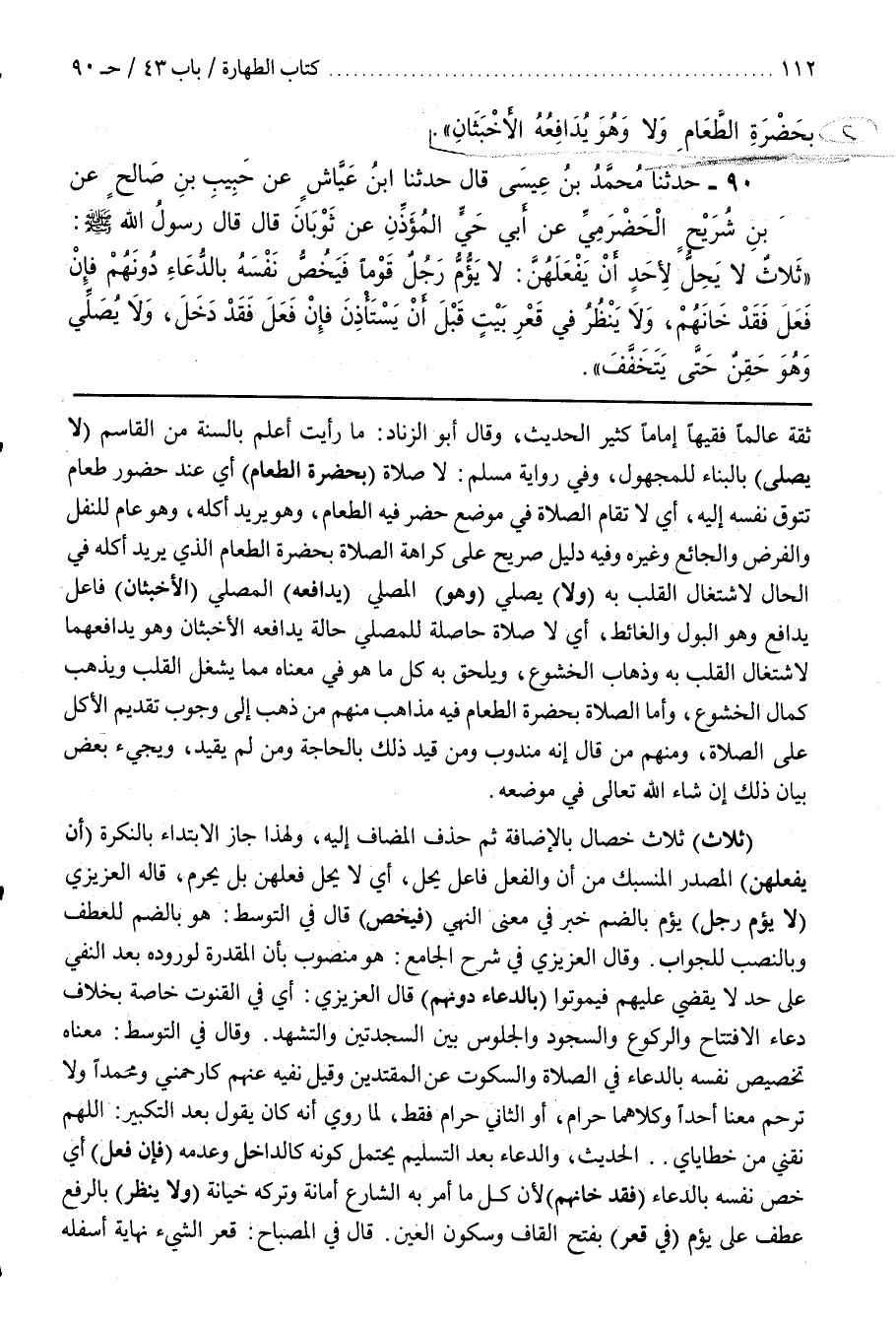 ثِقَةً عَالِمًا فَقِيهًا إِمَامًا كَثِيرَ الْحَدِيثِ قَالَ أَبُو الزِّنَادِ مَا رَأَيْتُ أَعْلَمَ بِالسُّنَّةِ مِنَ الْقَاسِمِ (لَا يُصَلَّى) بِالْبِنَاءِ لِلْمَجْهُولِ وَفِي رِوَايَةِ مُسْلِمٍ لَا صَلَاةَ (بِحَضْرَةِ الطَّعَامِ) أَيْ عِنْدَ حُضُورِ طَعَامٍ تَتُوقُ نَفْسُهُ إِلَيْهِ أَيْ لَا تُقَامُ الصَّلَاةُ فِي مَوْضِعٍ حَضَرَ فِيهِ الطَّعَامُ وَهُوَ يُرِيدُ أَكْلَهُ وَهُوَ عَامٌّ لِلنَّفْلِ وَالْفَرْضِ وَالْجَائِعِ وَغَيْرِهِ وَفِيهِ دَلِيلٌ صَرِيحٌ عَلَى كَرَاهَةِ الصَّلَاةِ بِحَضْرَةِ الطَّعَامِ الَّذِي يُرِيدُ أَكْلَهُ فِي الْحَالِ لِاشْتِغَالِ الْقَلْبِ بِهِ (وَلَا) يُصَلِّي (وَهُوَ) الْمُصَلِّي (يُدَافِعُهُ) الْمُصَلِّيَ (الْأَخْبَثَانِ) فَاعِلُ يُدَافِعُ وَهُوَ الْبَوْلُ وَالْغَائِطُ أَيْ لَا صَلَاةَ حَاصِلَةٌ لِلْمُصَلِّي حَالَةَ يُدَافِعُهُ الْأَخْبَثَانِ وَهُوَ يُدَافِعُهُمَا لِاشْتِغَالِ الْقَلْبِ بِهِ وَذَهَابِ الْخُشُوعِ وَيَلْحَقُ بِهِ كُلُّ مَا هُوَ فِي مَعْنَاهُ مِمَّا يَشْغَلُ الْقَلْبَ وَيُذْهِبُ كَمَالَ الْخُشُوعِ وَأَمَّا الصَّلَاةُ بِحَضْرَةِ الطَّعَامِ فِيهِ مَذَاهِبُ مِنْهُمْ مَنْ ذَهَبَ إِلَى وُجُوبِ تَقْدِيمِ الْأَكْلِ عَلَى الصَّلَاةِ وَمِنْهُمْ مَنْ قَالَ إِنَّهُ مَنْدُوبٌ وَمَنْ قَيَّدَ ذَلِكَ بِالْحَاجَةِ وَمَنْ لَمْ يُقَيِّدْ وَيَجِيءُ بَعْضُ بَيَانِ ذَلِكَ إِنْ شَاءَ اللَّهُ تَعَالَى فِي مَوْضِعِهِ