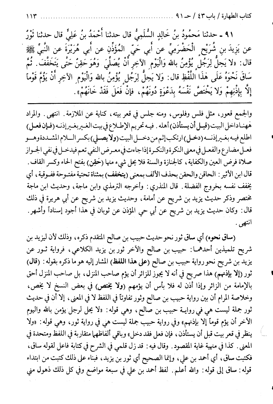 [91] (سَاقَ نَحْوَهُ) أَيْ سَاقَ ثَوْرٌ نَحْوَ حَدِيثِ حَبِيبِ بْنِ صَالِحٍ الْمُتَقَدِّمِ ذِكْرُهُ وَذَلِكَ لِأَنَّ لِيَزِيدَ بْنِ شُرَيْحٍ تِلْمِيذَيْنِ أَحَدُهُمَا حَبِيبُ بْنُ صَالِحٍ وَالْآخَرُ ثَوْرُ بْنُ يَزِيدَ الْكُلَاعِيُّ فَرِوَايَةُ ثَوْرٍ عَنْ يَزِيدَ بْنِ شُرَيْحٍ نَحْوَ رِوَايَةِ حَبِيبِ بْنِ صَالِحٍ (عَلَى هَذَا اللَّفْظِ) الْمُشَارِ إِلَيْهِ هُوَ مَا ذَكَرَهُ بِقَوْلِهِ (قَالَ) ثَوْرٌ (إِلَّا بِإِذْنِهِمْ) هَذَا صَرِيحٌ فِي أَنَّهُ لَا يَجُوزُ لِلزَّائِرِ أَنْ يَؤُمَّ صَاحِبَ الْمَنْزِلِ بَلْ صَاحِبُ الْمَنْزِلِ أَحَقُّ بِالْإِمَامَةِ مِنَ الزَّائِرِ وَإِذَا أَذِنَ لَهُ فَلَا بَأْسَ أَنْ يَؤُمَّهُمْ (وَلَا يَخْتَصُّ) فِي بَعْضِ النُّسَخِ لَا يَخُصُّ وَخُلَاصَةُ الْمَرَامِ أَنَّ بَيْنَ رِوَايَةِ حَبِيبِ بْنِ صَالِحٍ وَثَوْرٍ تَفَاوُتًا فِي اللَّفْظِ لَا فِي الْمَعْنَى إِلَّا أَنَّ فِي حَدِيثِ ثَوْرٍ جُمْلَةٌ لَيْسَتْ هِيَ فِي رِوَايَةِ حَبِيبِ بْنِ صَالِحٍ وَهِيَ قَوْلُهُ لَا يَحِلُّ لِرَجُلٍ يُؤْمِنُ بِاللَّهِ وَالْيَوْمِ الْآخِرِ أَنْ يَؤُمَّ قَوْمًا إِلَّا بِإِذْنِهِمْ وَفِي رِوَايَةِ حَبِيبٍ جُمْلَةٌ لَيْسَتْ هِيَ فِي رِوَايَةِ ثَوْرٍ وَهِيَ قَوْلُهُ وَلَا يَنْظُرْ فِي قَعْرِ بَيْتٍ قَبْلَ أَنْ يَسْتَأْذِنَ فَإِنْ فَعَلَ فَقَدْ دَخَلَ