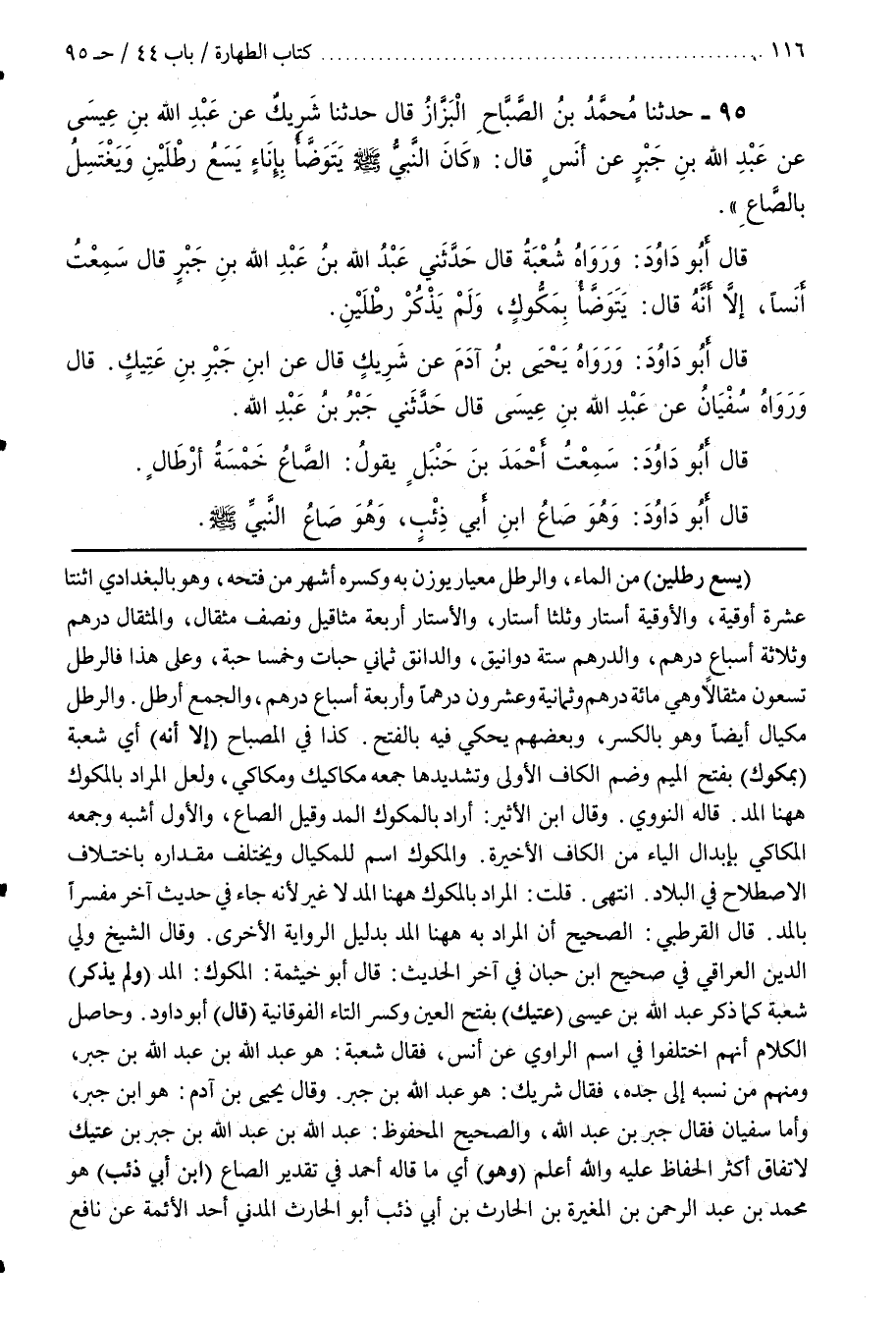 [95] (يَسَعُ رِطْلَيْنِ) مِنَ الْمَاءِ وَالرِّطْلُ مِعْيَارٌ يُوزَنُ بِهِ وَكَسْرُهُ أَشْهَرُ مِنْ فَتْحِهِ وَهُوَ بِالْبَغْدَادِيِّ اثنتا عشرة أوقية والأوقية أستار وثلثا أستار والأستار أربعة مثاقيل ونصف مثقال والمثقال درهم وثلاثة أسباع درهم والدرهم ستة دوانيق والدانق ثَمَانِي حَبَّاتٍ وَخُمُسَا حَبَّةٍ وَعَلَى هَذَا فَالرِّطْلُ تِسْعُونَ مِثْقَالًا وَهِيَ مِائَةُ دِرْهَمٍ وَثَمَانِيَةٌ وَعِشْرُونَ دِرْهَمًا وَأَرْبَعَةُ أَسْبَاعِ دِرْهَمٍ وَالْجَمْعُ أَرْطُلٌ