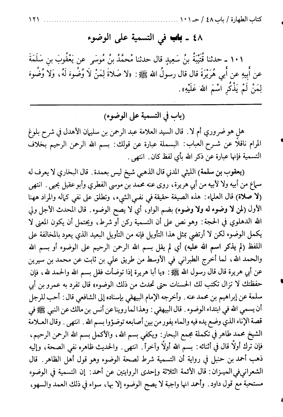 48 - (بَاب فِي التَّسْمِيَةِ عَلَى الْوُضُوءِ هَلْ هُوَ ضَرُورِيٌّ)