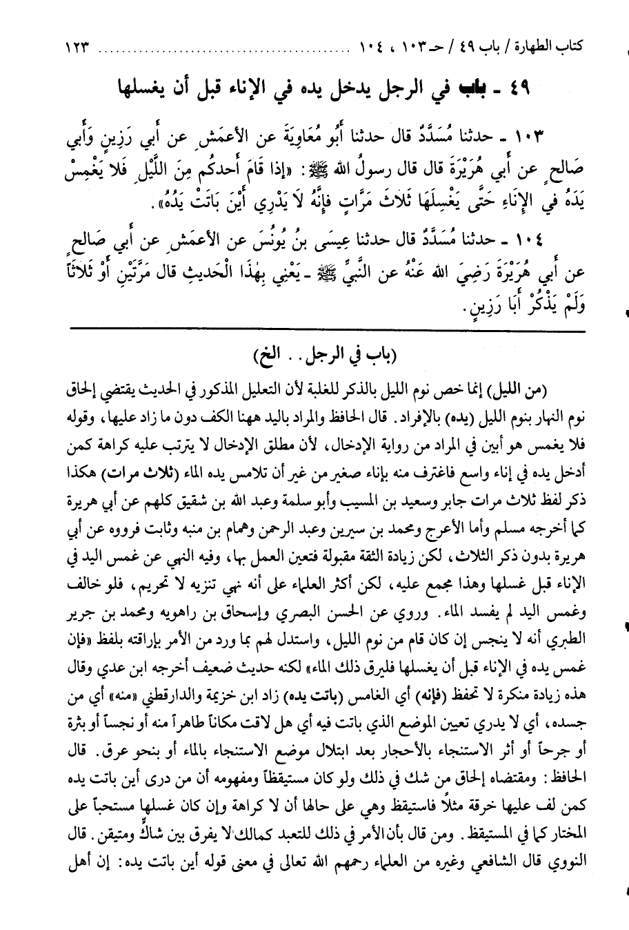 وَأَمَأَ الْأَعْرَجُ وَمُحَمَّدُ بْنُ سِيرِينَ وَعَبْدُ الرَّحْمَنِ وَهَمَّامُ بْنُ مُنَبِّهٍ وَثَابِتٌ فَرَوَوْهُ عَنْ أَبِي هُرَيْرَةَ بِدُونِ ذِكْرِ الثَّلَاثِ لَكِنَّ زِيَادَةُ الثِّقَةِ مَقْبُولَةٌ فَتَعَيَّنَ الْعَمَلُ بِهَا وَفِيهِ النَّهْيُ عَنْ غَمْسِ الْيَدِ فِي الْإِنَاءِ قَبْلَ غَسْلِهَا وَهَذَا مُجْمَعٌ عَلَيْهِ لَكِنَّ أَكْثَرَ الْعُلَمَاءِ عَلَى أَنَّهُ نَهْيُ تَنْزِيهٍ لَا تَحْرِيمٍ فَلَوْ خَالَفَ وَغَمَسَ الْيَدَ لَمْ يَفْسُدِ الْمَاءُ