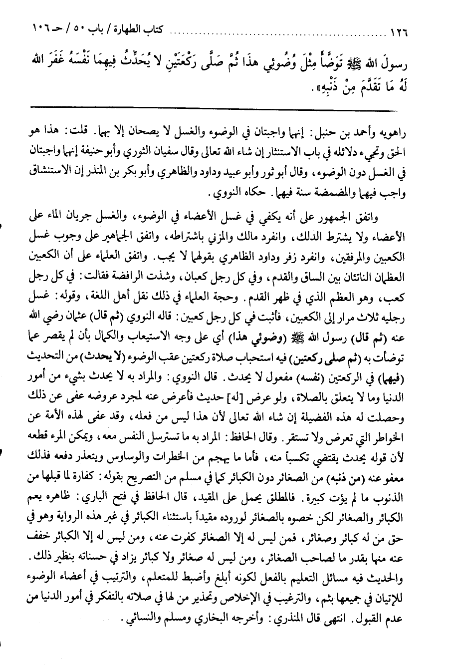 وَحُجَّةُ الْعُلَمَاءِ فِي ذَلِكَ نَقْلُ أَهْلِ اللُّغَةِ وَقَوْلُهُ غَسَلَ رِجْلَيْهِ ثَلَاثَ مِرَارٍ إِلَى الْكَعْبَيْنِ فَأَثْبَتَ فِي كُلِّ رِجْلٍ كَعْبَيْنِ قَالَهُ النَّوَوِيُّ (ثُمَّ قَالَ) عُثْمَانُ رَضِيَ اللَّهُ عَنْهُ (ثُمَّ قَالَ) رسول الله (وُضُوئِي هَذَا) أَيْ عَلَى وَجْهِ الِاسْتِيعَابِ وَالْكَمَالِ بِأَنْ لَمْ يَقْصُرْ عَمَّا تَوَضَّأْتُ بِهِ (ثُمَّ صَلَّى رَكْعَتَيْنِ) فِيهِ اسْتِحْبَابُ صَلَاةِ رَكْعَتَيْنِ عَقِبَ الْوُضُوءِ (لَا يُحَدِّثُ) مِنَ التَّحْدِيثِ (فِيهِمَا) فِي الرَّكْعَتَيْنِ (نَفْسَهُ) مَفْعُولُ لَا يُحَدِّثُ