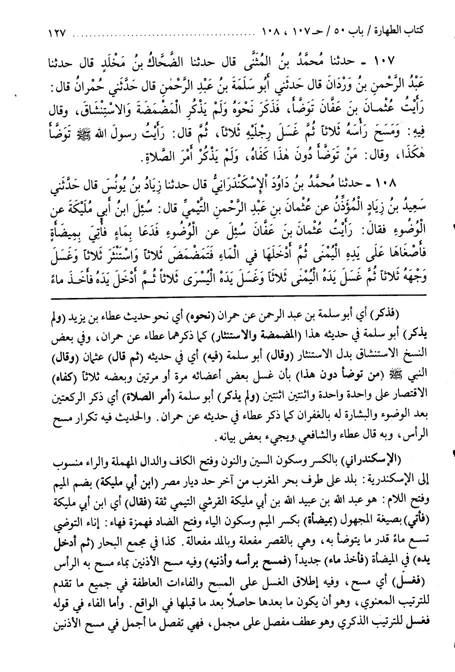 [107] (فَذَكَرَ) أَيْ أَبُو سَلَمَةَ بْنُ عَبْدِ الرَّحْمَنِ عَنْ حُمْرَانَ (نَحْوَهُ) أَيْ نَحْوَ حَدِيثِ عَطَاءِ بْنِ يَزِيدَ (وَلَمْ يَذْكُرْ) أَبُو سَلَمَةَ فِي حَدِيثِهِ هَذَا (الْمَضْمَضَةَ وَالِاسْتِنْثَارَ) كَمَا ذَكَرَهَا عَطَاءٌ عَنْ حُمْرَانَ وَفِي بَعْضِ النُّسَخِ الِاسْتِنْشَاقُ بَدَلَ الِاسْتِنْثَارِ (وَقَالَ) أَبُو سَلَمَةَ (فِيهِ) أَيْ فِي حديثه (ثم قال) عثمان (وقال) النبي (مَنْ تَوَضَّأَ دُونَ هَذَا) بِأَنْ غَسَلَ بَعْضَ أَعْضَائِهِ مَرَّةً أَوْ مَرَّتَيْنِ وَبَعْضَهُ ثَلَاثًا (كَفَاهُ) الِاقْتِصَارُ عَلَى وَاحِدَةٍ وَاحِدَةٍ وَاثْنَتَيْنِ اثْنَتَيْنِ (وَلَمْ يَذْكُرْ) أَبُو سَلَمَةَ (أَمْرَ الصَّلَاةِ) أَيْ ذَكَرَ الرَّكْعَتَيْنِ بَعْدَ الْوُضُوءِ وَالْبِشَارَةَ لَهُ بِالْغُفْرَانِ كَمَا ذَكَرَ عَطَاءٌ فِي حَدِيثِهِ عَنْ حُمْرَانَ