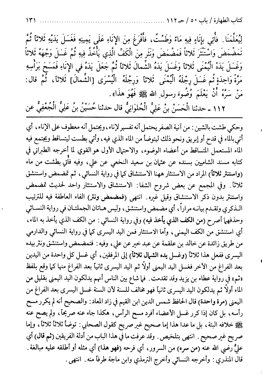 فَمَا شَاعَ بَيْنَ النَّاسِ أَنَّهُمْ يُدَلِّكُونَ الْيَدَ الْيُمْنَى بِقَلِيلٍ مِنَ الْمَاءِ أَوَّلًا ثُمَّ يُدَلِّكُونَ الْيَدَ الْيُسْرَى ثَانِيًا فَهُوَ مُخَالِفٌ لِلسُّنَّةِ لِأَنَّ السُّنَّةَ غَسْلُ الْيُسْرَى بَعْدَ الْفَرَاغِ مِنَ الْيُمْنَى (مَرَّةً وَاحِدَةً) قَالَ الْحَافِظُ بن الْقَيِّمِ فِي زَادِ الْمَعَادِ وَالصَّحِيحُ أَنَّهُ لَمْ يُكَرِّرْ مَسْحَ رَأْسِهِ بَلْ كَانَ إِذَا كَرَّرَ غَسْلَ الْأَعْضَاءِ أَفْرَدَ مَسْحَ الرَّأْسِ هَكَذَا جَاءَ عنه صريحا ولم يصح عنه خِلَافُهُ أَلْبَتَّةَ بَلْ مَا عَدَا هَذَا إِمَّا صَحِيحٌ غَيْرُ صَرِيحٍ كَقَوْلِ الصَّحَابِيِّ تَوَضَّأَ ثَلَاثًا ثَلَاثًا وَإِمَّا صَرِيحٌ غَيْرُ صَحِيحٍ