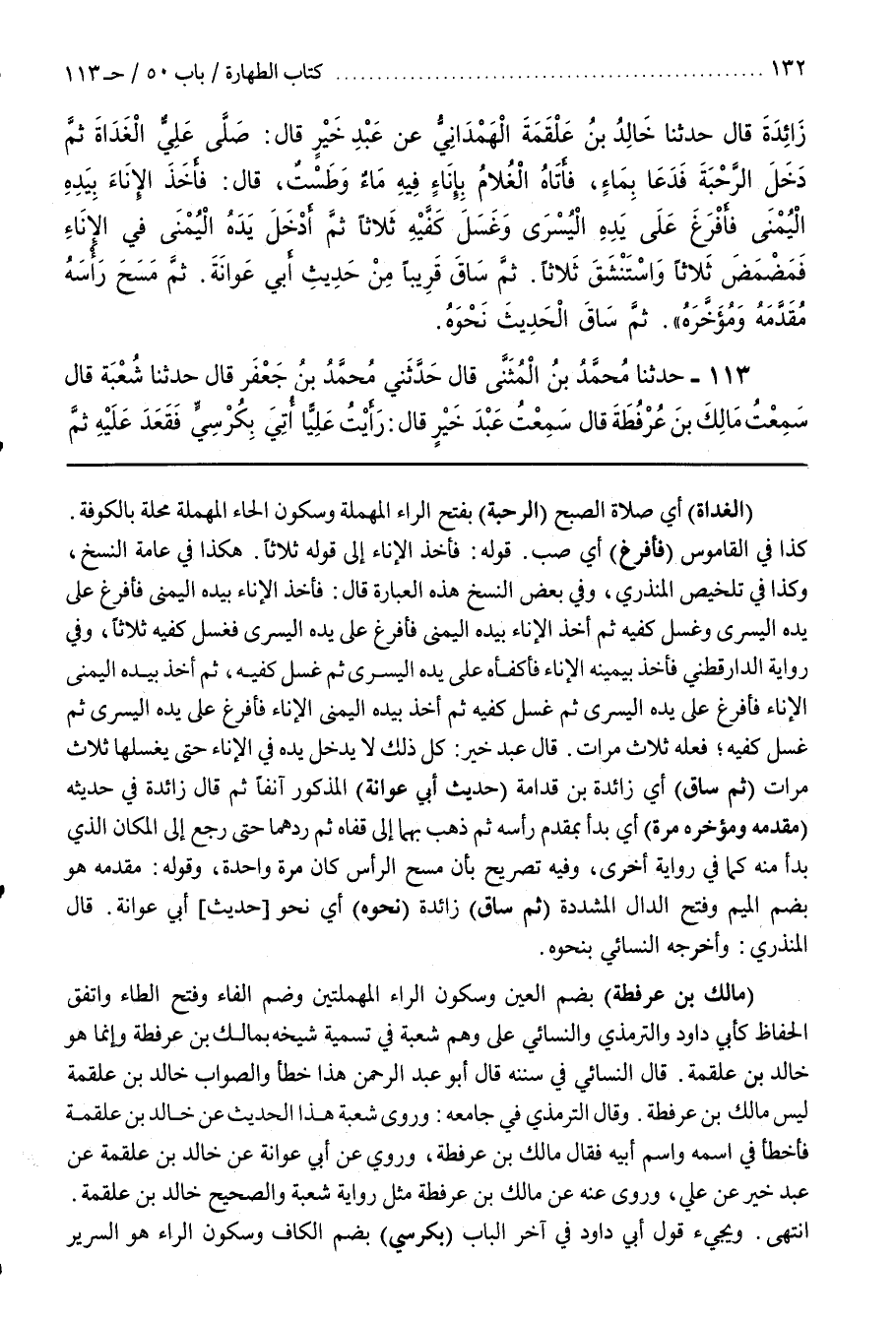 [113] (مَالِكُ بْنُ عُرْفُطَةَ) بِضَمِّ الْعَيْنِ وَسُكُونِ الرَّاءِ الْمُهْمَلَتَيْنِ وَضَمِّ الْفَاءِ وَفَتْحِ الطَّاءِ وَاتَّفَقَ الْحُفَّاظُ كَأَبِي دَاوُدَ وَالتِّرْمِذِيِّ وَالنَّسَائِيِّ عَلَى وَهْمِ شُعْبَةَ فِي تَسْمِيَةِ شَيْخِهِ بِمَالِكِ بْنِ عُرْفُطَةَ وَإِنَّمَا هُوَ خَالِدُ بْنُ عَلْقَمَةَ