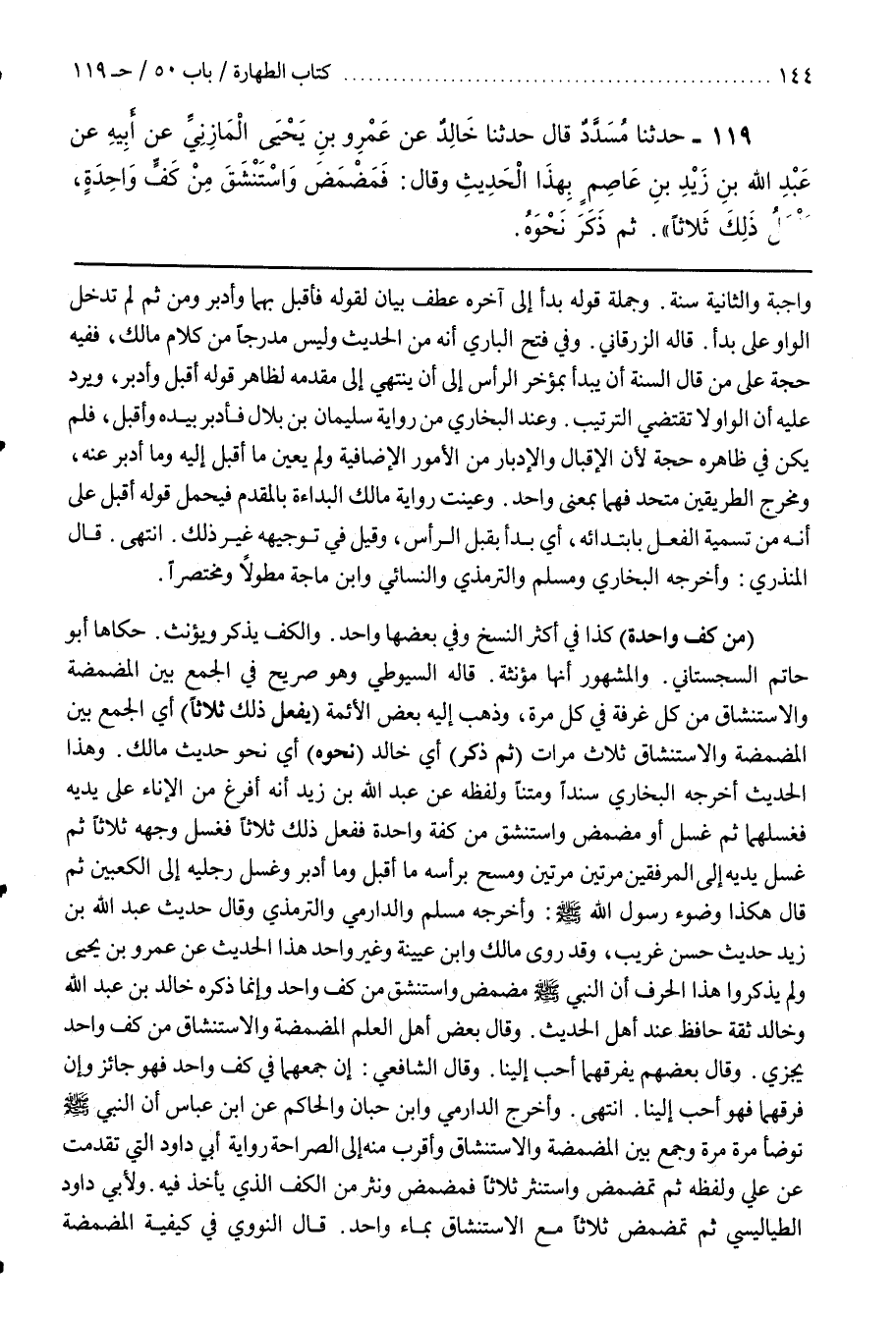 وَهَذَا الْحَدِيثُ أَخْرَجَهُ الْبُخَارِيُّ سَنَدًا وَمَتْنًا وَلَفْظُهُ عَنْ عَبْدِ اللَّهِ بْنِ زَيْدٍ أَنَّهُ أَفْرَغَ مِنَ الْإِنَاءِ عَلَى يَدَيْهِ فَغَسَلَهُمَا ثُمَّ غَسَلَ أَوْ مَضْمَضَ وَاسْتَنْشَقَ مِنْ كَفَّةٍ وَاحِدَةً فَفَعَلَ ذَلِكَ ثَلَاثًا فَغَسَلَ وَجْهَهُ ثَلَاثًا ثُمَّ غَسَلَ يَدَيْهِ إِلَى الْمَرْفِقَيْنِ مَرَّتَيْنِ مَرَّتَيْنِ وَمَسَحَ بِرَأْسِهِ مَا أَقْبَلَ وَمَا أَدْبَرَ وَغَسَلَ رِجْلَيْهِ إِلَى الْكَعْبَيْنِ ثُمَّ قال هكذا وضوء رسول الله وَأَخْرَجَهُ مُسْلِمٌ وَالدَّارِمِيُّ وَالتِّرْمِذِيُّ وَقَالَ حَدِيثُ عَبْدِ اللَّهِ بْنُ زَيْدٍ حَدِيثٌ حَسَنٌ غَرِيبٌ وَقَدْ روى مالك وبن عُيَيْنَةَ وَغَيْرُ وَاحِدٍ هَذَا الْحَدِيثَ عَنْ عَمْرِو بْنِ يَحْيَى وَلَمْ يَذْكُرُوا هَذَا الْحَرْفَ أَنَّ النبي مَضْمَضَ وَاسْتَنْشَقَ مِنْ كَفٍّ وَاحِدٍ وَإِنَّمَا ذَكَرَهُ خَالِدُ بْنُ عَبْدِ اللَّهِ وَخَالِدٌ ثِقَةٌ حَافِظٌ عِنْدَ أَهْلِ الْحَدِيثِ