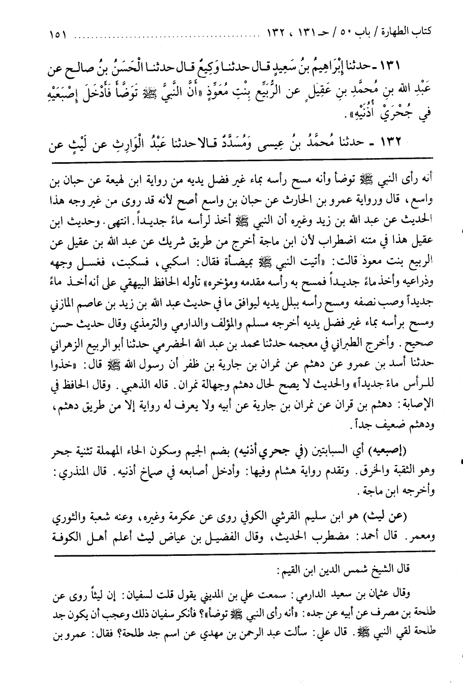 انتهى وحديث بن عقيل هذا في متنه اضطراب لأن بن مَاجَهْ أَخْرَجَ مِنْ طَرِيقِ شَرِيكٍ عَنْ عَبْدِ اللَّهِ بْنِ عَقِيلٍ عَنِ الرُّبَيِّعِ بِنْتِ مُعَوِّذٍ قالت أتيت النبي بِمِيضَأَةٍ فَقَالَ اسْكُبِي فَسَكَبْتُ فَغَسَلَ وَجْهَهُ وَذِرَاعَيْهِ وأخذ ماءا جَدِيدًا فَمَسَحَ بِهِ رَأْسَهُ مُقَدَّمَهُ وَمُؤَخَّرَهُ تَأَوَّلَهُ الحافظ البيهقي على أنه أخذ ماءا جَدِيدًا وَصَبَّ نِصْفَهُ وَمَسَحَ رَأْسَهُ بِبَلَلِ يَدَيْهِ لِيُوَافِقَ مَا فِي حَدِيثِ عَبْدِ اللَّهِ بْنِ زَيْدِ بْنِ عَاصِمٍ الْمَازِنِيِّ وَمَسَحَ بِرَأْسِهِ بِمَاءٍ غَيْرِ فَضْلِ يَدَيْهِ أَخْرَجَهُ مُسْلِمٌ وَالْمُؤَلِّفُ وَالدَّارِمِيُّ وَالتِّرْمِذِيُّ وَقَالَ حَدِيثٌ حَسَنٌ صَحِيحٌ