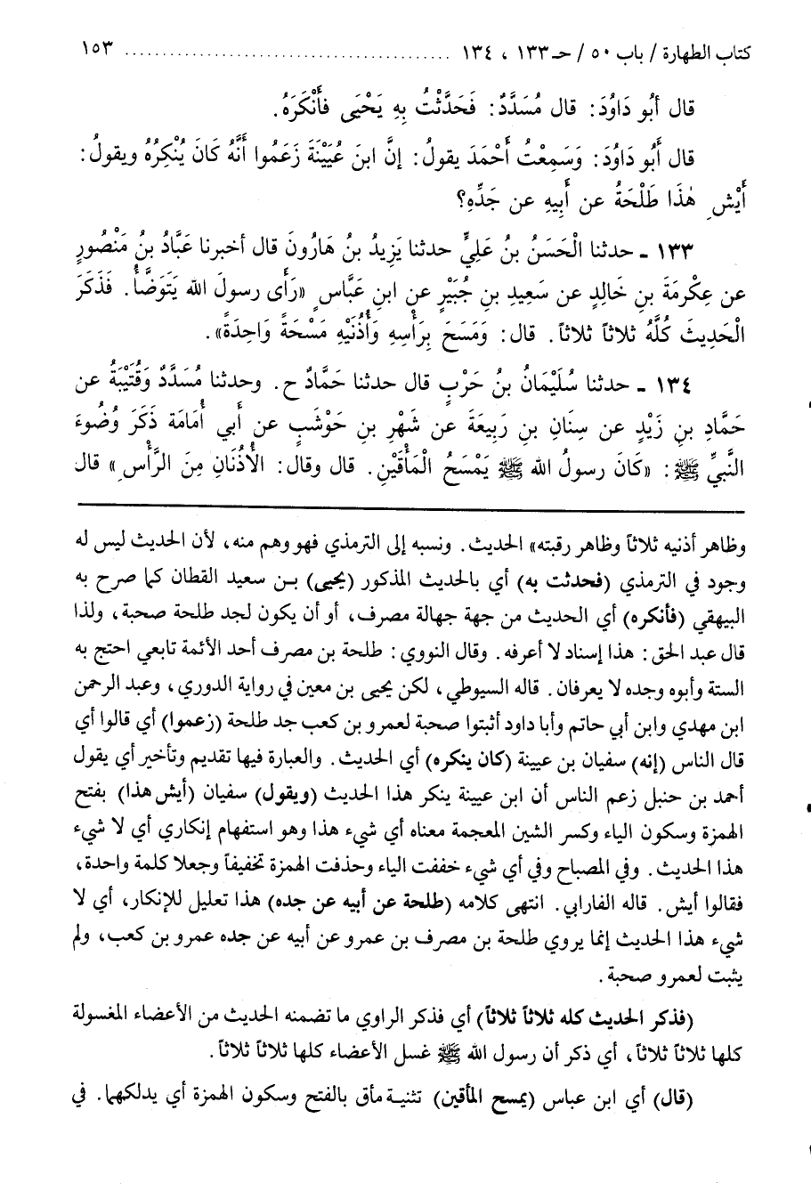 [133] (فَذَكَرَ الْحَدِيثَ كُلَّهُ ثَلَاثًا ثَلَاثًا) أَيْ فَذَكَرَ الرَّاوِي مَا تَضَمَّنَهُ الْحَدِيثُ مِنَ الْأَعْضَاءِ الْمَغْسُولَةِ كُلِّهَا ثَلَاثًا ثَلَاثًا أَيْ ذَكَرَ أَنَّ رَسُولَ الله غَسَلَ الْأَعْضَاءَ كُلَّهَا ثَلَاثًا ثَلَاثًا