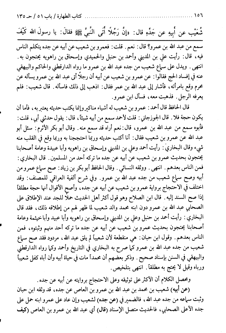قال بن الصَّلَاحِ وَهُوَ قَوْلُ أَكْثَرِ أَهْلِ الْحَدِيثِ حَمْلًا لِلْجَدِّ عِنْدَ الْإِطْلَاقِ عَلَى الصَّحَابِيِّ عَبْدِ اللَّهِ بْنِ عَمْرٍو دُونَ ابْنِهِ مُحَمَّدٍ وَالِدِ شُعَيْبٍ لِمَا ظَهَرَ لَهُمْ مِنْ إِطْلَاقِهِ ذَلِكَ فَقَدْ قَالَ الْبُخَارِيُّ رَأَيْتُ أَحْمَدَ بْنَ حَنْبَلٍ وَعَلِيَّ بن المديني وإسحاق بن راهويه وأبا عبيد وَأَبَا خَيْثَمَةَ وَعَامَّةَ أَصْحَابِنَا يَحْتَجُّونَ بِحَدِيثِ عَمْرِو بْنِ شُعَيْبٍ عَنْ أَبِيهِ عَنْ جَدِّهِ مَا تَرَكَهُ أَحَدٌ مِنْهُمْ وَثَبَّتُوهُ فَمَنِ النَّاسُ بَعْدَهُمْ