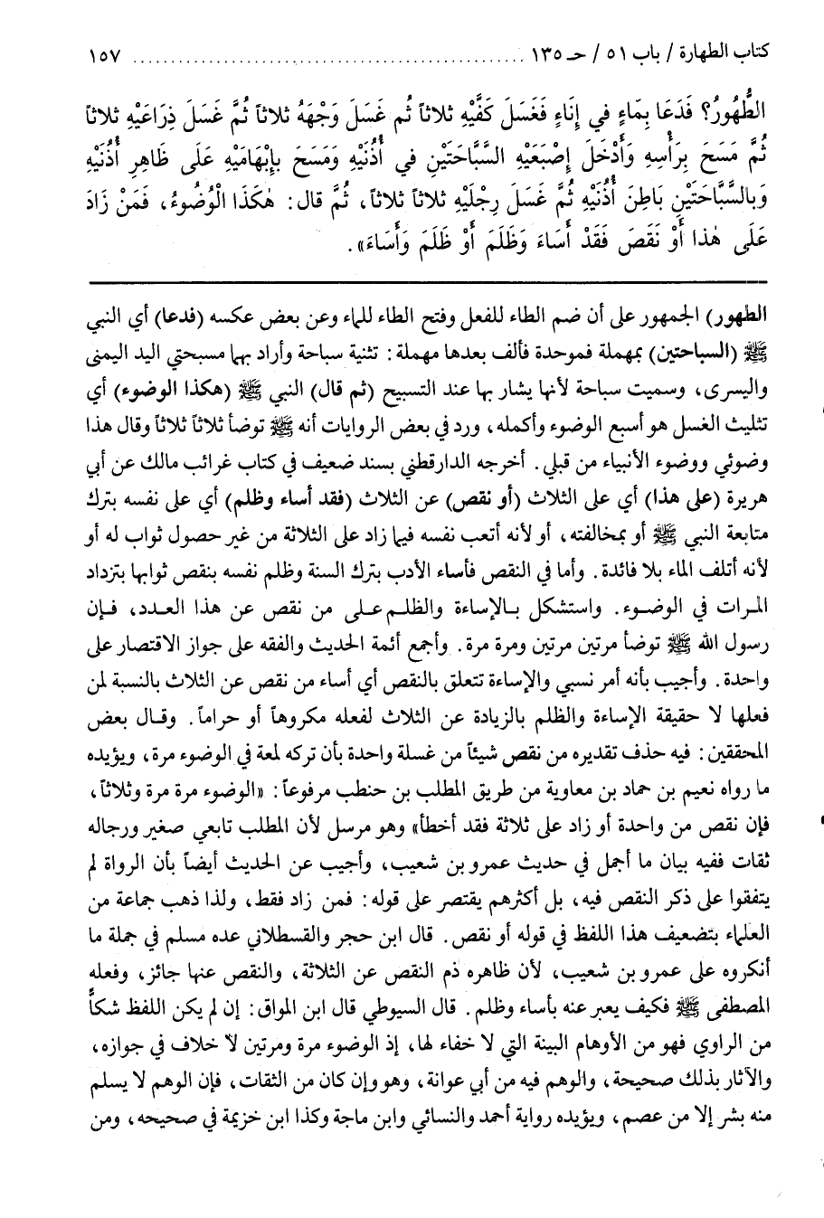 وَقَالَ بَعْضُ الْمُحَقِّقِينَ فِيهِ حَذْفٌ تَقْدِيرُهُ مَنْ نَقَصَ شَيْئًا مِنْ غَسْلَةٍ وَاحِدَةٍ بِأَنْ تَرَكَهُ لُمْعَةً فِي الْوُضُوءِ مَرَّةً وَيُؤَيِّدُهُ مَا رَوَاهُ نُعَيْمُ بْنُ حَمَّادِ بْنِ مُعَاوِيَةَ مِنْ طَرِيقِ الْمُطَّلِبِ بْنِ حَنْطَبٍ مَرْفُوعًا الْوُضُوءُ مَرَّةً مَرَّةً وَثَلَاثًا فَإِنْ نقص من وَاحِدَةٍ أَوْ زَادَ عَلَى ثَلَاثَةٍ فَقَدْ أَخْطَأَ وَهُوَ مُرْسَلٌ لِأَنَّ الْمُطَّلِبَ تَابِعِيٌّ صَغِيرٌ وَرِجَالُهُ ثِقَاتٌ فَفِيهِ بَيَانُ مَا أُجْمِلَ فِي حَدِيثِ عَمْرِو بْنِ شُعَيْبٍ وَأُجِيبَ عَنِ الْحَدِيثِ أَيْضًا بِأَنَّ الرُّوَاةَ لَمْ يَتَّفِقُوا عَلَى ذِكْرِ النَّقْصِ فِيهِ بَلْ أَكْثَرُهُمْ يَقْتَصِرُ عَلَى قَوْلِهِ فَمَنْ زَادَ فَقَطْ وَلِذَا ذَهَبَ جَمَاعَةٌ مِنَ الْعُلَمَاءِ بِتَضْعِيفِ هَذَا اللَّفْظِ فِي قَوْلِهِ أَوْ نَقَصَ