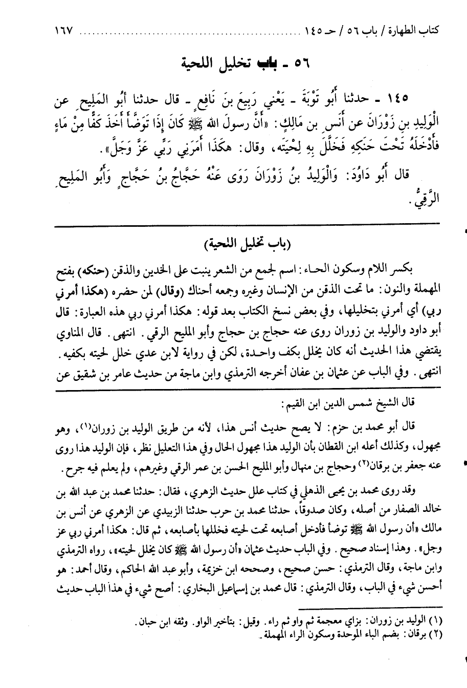 ــــــــــــQقَالَ الشَّيْخُ شَمْسُ الدِّينِ بْنُ الْقَيِّمِ قَالَ أَبُو مُحَمَّدِ بْنُ حُزُمٍ لَا يَصِحّ حَدِيث أَنَسٍ هَذَا لِأَنَّهُ مِنْ طَرِيق الْوَلِيدِ بْنِ زوران (1) وهو مجهول وكذلك أعله بن الْقَطَّانِ بِأَنَّ الْوَلِيدَ هَذَا مَجْهُول الْحَال وَفِي هَذَا التَّعْلِيل نَظَر فَإِنَّ الْوَلِيدَ هَذَا رَوَى عَنْهُ جَعْفَرُ بْنُ بَرْقَانَ (2) وَحَجَّاجُ بْنُ مِنْهَالٍ وَأَبُو الْمُلَيْحِ الْحَسَنُ بْنُ عُمَرَ الرَّقِّيُّ وَغَيْرهمْ وَلَمْ يُعْلَم فِيهِ جَرْح