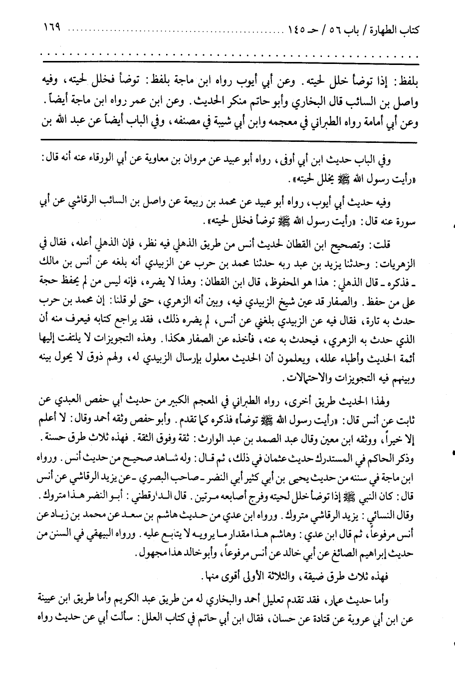 بِلَفْظِ إِذَا تَوَضَّأَ خَلَّلَ لِحْيَتَهُ وَعَنْ أَبِي أيوب رواه بن مَاجَهْ بِلَفْظِ تَوَضَّأَ فَخَلَّلَ لِحْيَتَهُ وَفِيهِ وَاصِلُ بْنُ السَّائِبِ قَالَ الْبُخَارِيُّ وَأَبُو حَاتِمٍ مُنْكَرُ الحديث