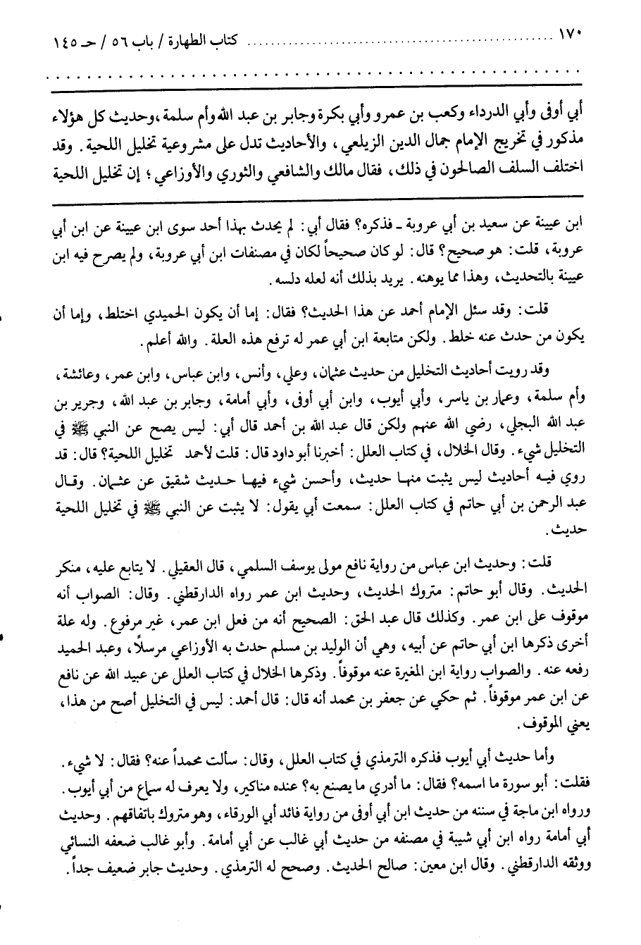 وَقَالَ عَبْدُ الرَّحْمَنِ بْنُ أَبِي حَاتِمٍ فِي كِتَاب الْعِلَل سَمِعْت أَبِي يَقُول لَا يَثْبُت عَنْ النَّبِيّ صَلَّى اللَّه عَلَيْهِ وَسَلَّمَ في تخليل اللحية حديث