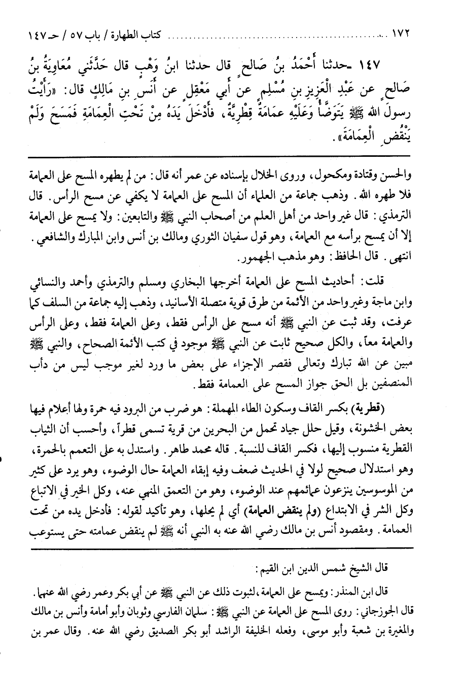 ــــــــــــQقَالَ الشَّيْخُ شَمْسُ الدِّينِ بْنُ الْقَيِّمِ قَالَ بن المدر وَيَمْسَح عَلَى الْعِمَامَة لِثُبُوتِ ذَلِكَ عَنْ النَّبِيّ صَلَّى اللَّه عَلَيْهِ وَسَلَّمَ وَعَنْ أَبِي بَكْرٍ وَعُمَرَ رَضِيَ اللَّه عَنْهُمَا