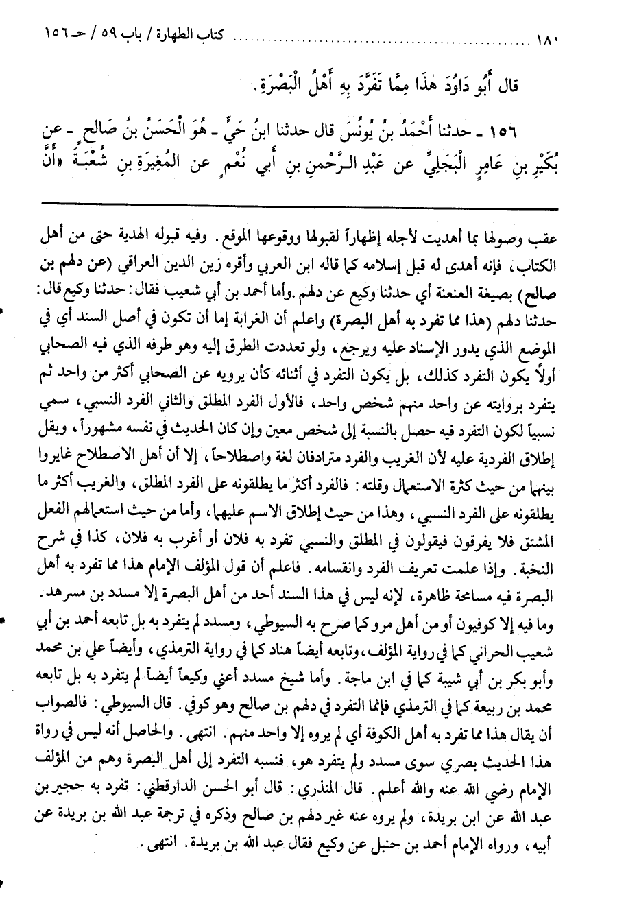 فَاعْلَمْ أَنَّ قَوْلَ الْمُؤَلِّفِ الْإِمَامِ هَذَا مِمَّا تَفَرَّدَ بِهِ أَهْلُ الْبَصْرَةِ فِيهِ مُسَامَحَةٌ ظَاهِرَةٌ لِإِنَّهُ لَيْسَ فِي هَذَا السَّنَدِ أَحَدٌ مِنْ أَهْلِ الْبَصْرَةِ إِلَّا مُسَدَّدَ بْنَ مُسَرْهَدٍ