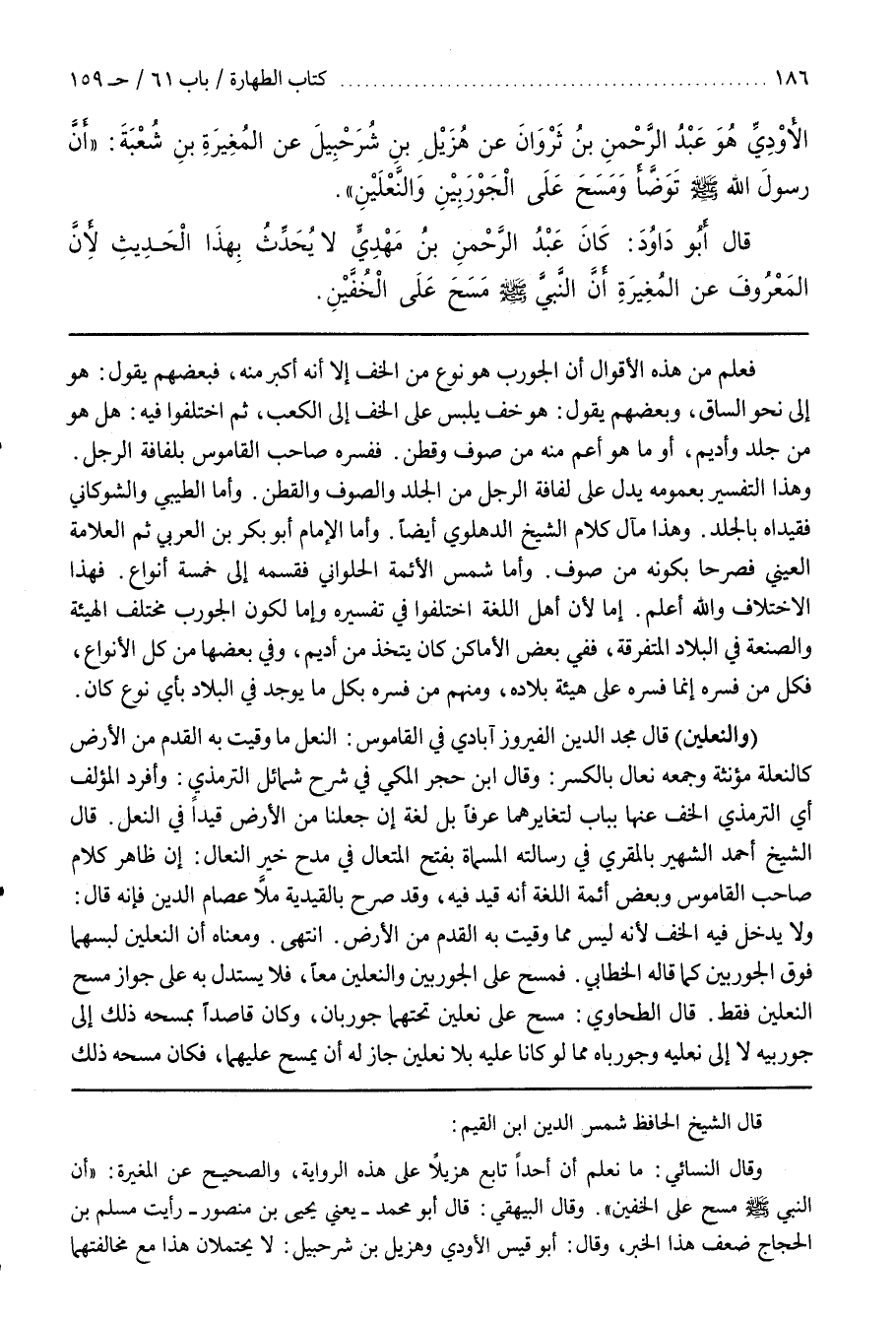 ــــــــــــQقَالَ الشَّيْخُ الْحَافِظُ شَمْسُ الدِّينِ بْنُ الْقَيِّمِ وَقَالَ النَّسَائِيُّ مَا نَعْلَم أَنَّ أَحَدًا تَابَعَ هُزَيْلًا عَلَى هَذِهِ الرِّوَايَة وَالصَّحِيح عَنْ الْمُغِيرَةِ أَنَّ النَّبِيّ صَلَّى اللَّه عَلَيْهِ وَسَلَّمَ مَسَحَ عَلَى الْخُفَّيْنِ
