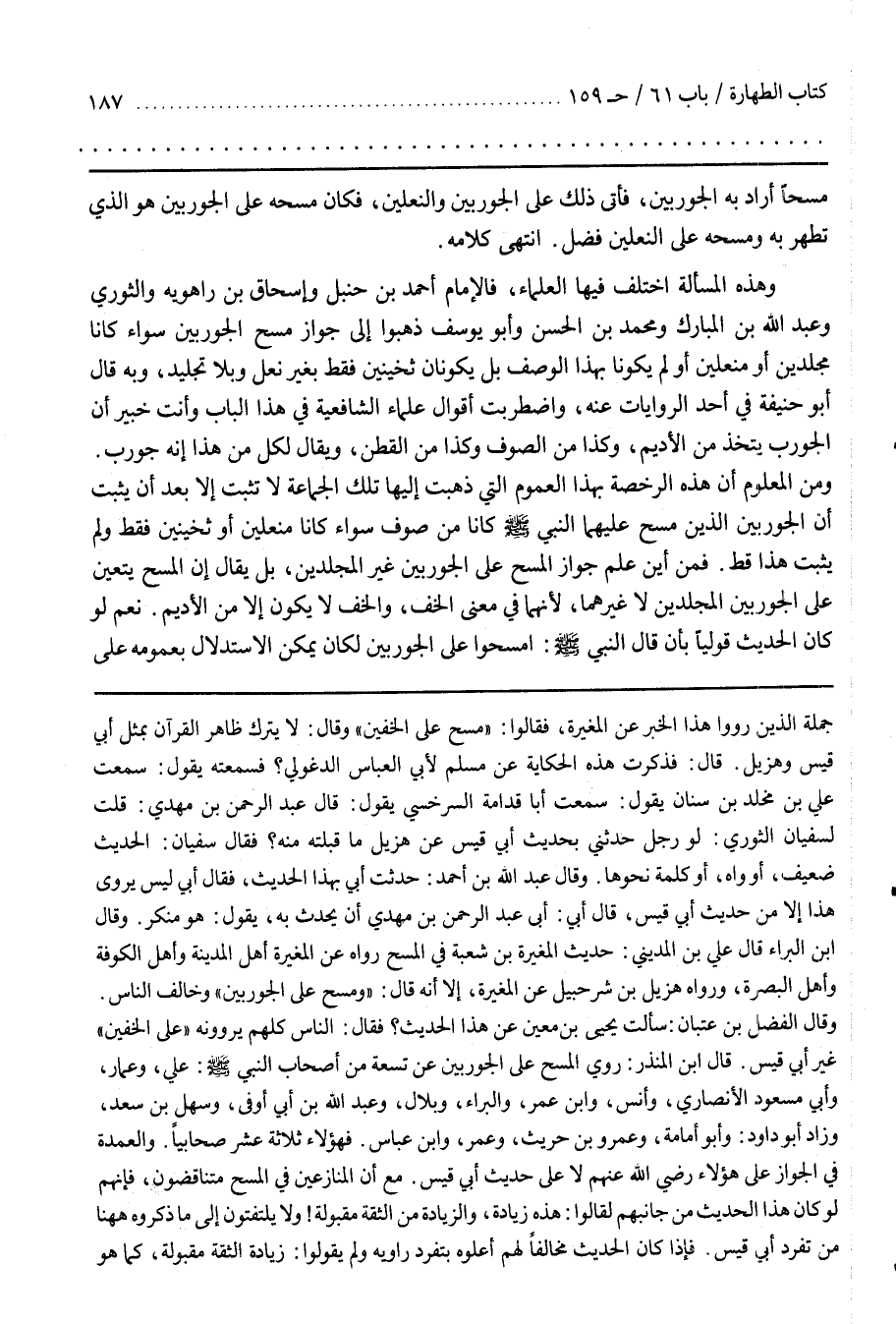 وَهَذِهِ الْمَسْأَلَةُ اخْتَلَفَ فِيهَا الْعُلَمَاءُ فَالْإِمَامُ أَحْمَدُ بْنُ حَنْبَلٍ وَإِسْحَاقُ بْنُ رَاهْوَيْهِ وَالثَّوْرِيُّ وَعَبْدُ اللَّهِ بْنُ الْمُبَارَكِ وَمُحَمَّدُ بْنُ الْحَسَنِ وَأَبُو يُوسُفَ ذَهَبُوا إِلَى جَوَازِ مَسْحِ الْجَوْرَبَيْنِ سَوَاءٌ كَانَا مُجَلَّدَيْنِ أَوْ مُنَعَّلَيْنِ أَوْ لَمْ يَكُونَا بِهَذَا الْوَصْفِ بَلْ يَكُونَانِ ثَخِينَيْنِ فَقَطْ بِغَيْرِ نَعْلٍ وَبِلَا تَجْلِيدٍ وَبِهِ قَالَ أَبُو حَنِيفَةَ فِي أَحَدِ الرِّوَايَاتِ عَنْهُ وَاضْطَرَبَتْ أَقْوَالُ عُلَمَاءِ الشَّافِعِيَّةِ فِي هَذَا الْبَابِ وَأَنْتَ خَبِيرٌ أَنَّ الْجَوْرَبَ يُتَّخَذُ مِنَ الْأَدِيمِ وَكَذَا مِنَ الصُّوفِ وَكَذَا مِنَ الْقُطْنِ وَيُقَالُ لِكُلٍّ مِنْ هَذَا إِنَّهُ جَوْرَبٌ