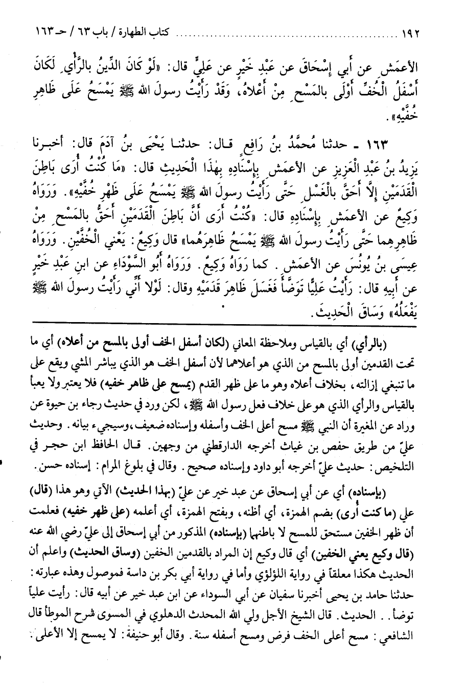 [163] (بِإِسْنَادِهِ) أَيْ عَنْ أَبِي إِسْحَاقَ عَنْ عَبْدِ خَيْرٍ عَنْ عَلِيٍّ (بِهَذَا الْحَدِيثِ) الْآتِي وَهُوَ هَذَا (قَالَ) عَلِيٌّ (مَا كُنْتُ أُرَى) بِضَمِّ الْهَمْزَةِ أَيْ أَظُنُّهُ وَبِفَتْحِ الْهَمْزَةِ أَيْ أَعْلَمُهُ (عَلَى ظَهْرِ خُفَّيْهِ) فَعَلِمْتُ أَنَّ ظَهْرَ الْخُفَّيْنِ مُسْتَحِقٌّ لِلْمَسْحِ لَا بَاطِنُهُمَا (بِإِسْنَادِهِ) الْمَذْكُورِ مِنْ أَبِي إِسْحَاقَ إِلَى عَلِيٍّ رَضِيَ اللَّهُ عَنْهُ [164] (قَالَ وَكِيعٌ يَعْنِي الْخُفَّيْنِ) أَيْ قال وكيع إن المراد بالقدمين الخفين (وَسَاقَ الْحَدِيثَ) وَاعْلَمْ أَنَّ الْحَدِيثَ هَكَذَا مُعَلَّقًا فِي رِوَايَةِ اللُّؤْلُؤِيِّ وَأَمَّا فِي رِوَايَةِ أَبِي بَكْرِ بْنِ دَاسَةَ فَمَوْصُولٌ وَهَذِهِ عِبَارَتُهُ حَدَّثَنَا حَامِدُ بْنُ يَحْيَى أَخْبَرَنَا سُفْيَانُ عَنْ أَبِي السوداء عن بن عَبْدِ خَيْرٍ عَنْ أَبِيهِ قَالَ رَأَيْتُ عَلِيًّا تَوَضَّأَ