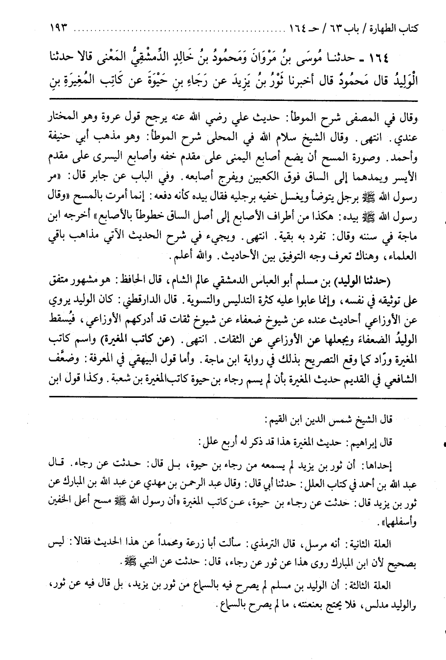 ــــــــــــQقَالَ الشَّيْخُ شَمْسُ الدِّينِ بْنُ الْقَيِّمِ قَالَ إِبْرَاهِيمُ حَدِيث الْمُغِيرَةِ هَذَا قَدْ ذُكِرَ لَهُ أَرْبَع عِلَل إِحْدَاهَا أَنَّ ثَوْرَ بْنَ يَزِيدَ لَمْ يَسْمَعهُ مِنْ رَجَاءَ بْنَ حَيْوَةَ بَلْ قَالَ حُدِّثْت عَنْ رَجَاءٍ