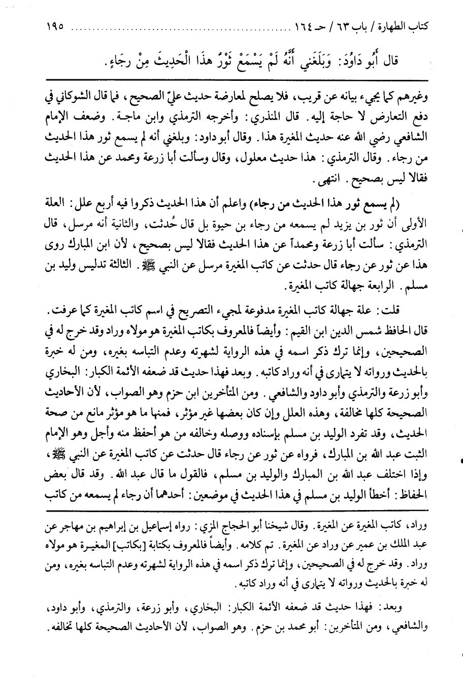 (لَمْ يَسْمَعْ ثَوْرٌ هَذَا الْحَدِيثَ مِنْ رَجَاءٍ) وَاعْلَمْ أَنَّ هَذَا الْحَدِيثَ ذَكَرُوا فِيهِ أَرْبَعَ عِلَلٍ الْعِلَّةُ الْأُولَى أَنَّ ثَوْرَ بْنَ يَزِيدَ لَمْ يَسْمَعْهُ مِنْ رَجَاءِ بْنِ حَيْوَةَ بَلْ قَالَ حُدِّثْتُ وَالثَّانِيَةُ أَنَّهُ مُرْسَلٌ قَالَ التِّرْمِذِيُّ سَأَلْتُ أَبَا زُرْعَةَ وَمُحَمَّدًا عَنْ هَذَا الْحَدِيثِ فقالا ليس بصحيح لأن بن الْمُبَارَكِ رَوَى هَذَا عَنْ ثَوْرٍ عَنْ رَجَاءٍ قَالَ حُدِّثْتُ عَنْ كَاتِبِ الْمُغِيرَةِ مُرْسَلٌ عَنِ النَّبِيِّ صَلَّى اللَّهُ عَلَيْهِ وَسَلَّمَ