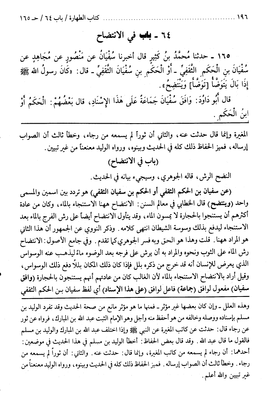وَفِي جَامِعِ الْأُصُولِ الِانْتِضَاحُ رَشُّ الْمَاءِ عَلَى الثَّوْبِ وَنَحْوِهِ وَالْمُرَادُ بِهِ أَنْ يرش على فرجه بعد الوضوء ماءا لِيُذْهِبَ عَنْهُ الْوَسْوَاسَ الَّذِي يَعْرِضُ لِلْإِنْسَانِ أَنَّهُ قَدْ خَرَجَ مِنْ ذَكَرِهِ بَلَلٌ فَإِذَا كَانَ ذَلِكَ الْمَكَانُ بَلَلًا دَفَعَ ذَلِكَ الْوَسْوَاسَ وَقِيلَ أَرَادَ بِالِانْتِضَاحِ الِاسْتِنْجَاءَ بِالْمَاءِ لِأَنَّ الْغَالِبَ كَانَ مِنْ عَادَتِهِمْ أَنَّهُمْ يَسْتَنْجُونَ بِالْحِجَارَةِ (وَافَقَ سُفْيَانَ) مَفْعُولٌ لِوَافَقَ (جَمَاعَةٌ) فَاعِلٌ لِوَافَقَ (عَلَى هَذَا الْإِسْنَادِ) أَيْ لَفْظُ سُفْيَانَ بْنِ الْحَكَمِ الثَّقَفِيِّ