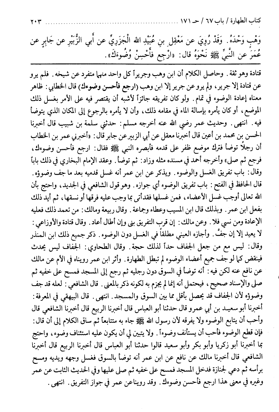 وحاصل الكلام أن بن وَهْبٍ وَجَرِيرًا كُلُّ وَاحِدٍ مِنْهُمَا مُتَفَرِّدٌ عَنْ شَيْخِهِ فَلَمْ يَرْوِ عَنْ قَتَادَةَ إِلَّا جَرِيرٌ ولم يرو عن جرير إلا بن وَهْبٍ (ارْجِعْ فَأَحْسِنْ وُضُوءَكَ) قَالَ الْخَطَّابِيُّ ظَاهِرُ مَعْنَاهُ إِعَادَةُ الْوُضُوءِ فِي تَمَامٍ وَلَوْ كَانَ تَفْرِيقُهُ جَائِزًا لَأَشْبَهَ أَنْ يَقْتَصِرَ فِيهِ عَلَى الْأَمْرِ بِغَسْلِ ذَلِكَ الْمَوْضِعِ أَوْ كَانَ يَأْمُرُهُ بِإِسَالَةِ الْمَاءِ فِي مَقَامِهِ ذَلِكَ وَأَنْ لَا يَأْمُرَهُ بِالرُّجُوعِ إِلَى الْمَكَانِ الَّذِي يَتَوَضَّأُ فِيهِ