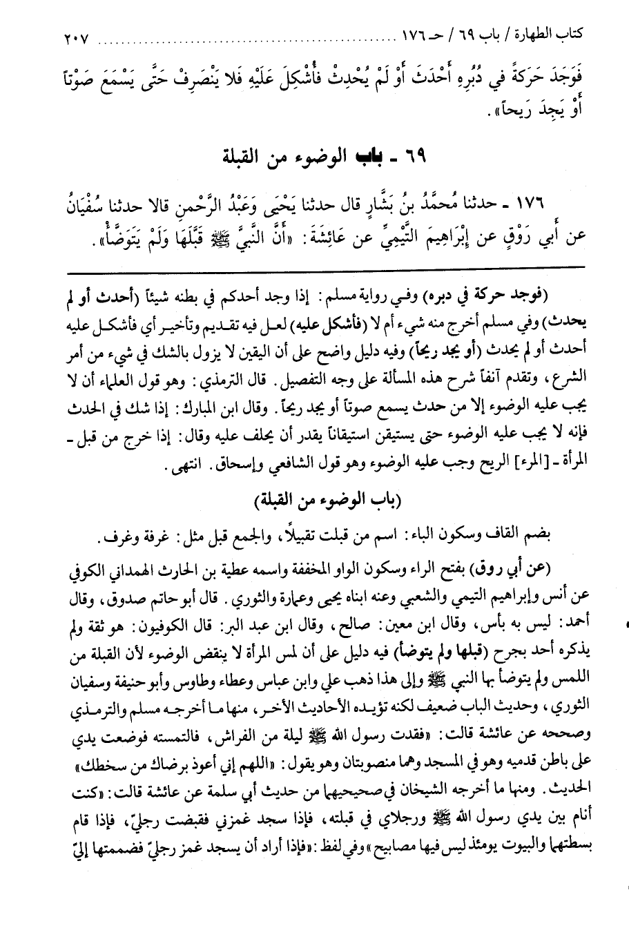 قَالَ أَبُو حَاتِمٍ صَدُوقٌ وَقَالَ أَحْمَدُ لَيْسَ بِهِ بَأْسٌ وَقَالَ بن معين صالح وقال بن عَبْدِ الْبَرِّ قَالَ الْكُوفِيُّونَ هُوَ ثِقَةٌ وَلَمْ يَذْكُرْهُ أَحَدٌ بِجَرْحٍ (قَبَّلَهَا وَلَمْ يَتَوَضَّأْ) فِيهِ دَلِيلٌ عَلَى أَنَّ لَمْسَ الْمَرْأَةِ لَا يَنْقُضُ الْوُضُوءَ لِأَنَّ الْقُبْلَةَ مِنَ اللَّمْسِ وَلَمْ يَتَوَضَّأْ بِهَا النَّبِيُّ صَلَّى اللَّهُ عَلَيْهِ وَسَلَّمَ وَإِلَى هذا ذهب على وبن عباس وعطاء وطاوس وأبو حنيفة وسيفان الثَّوْرِيُّ وَحَدِيثُ الْبَابِ ضَعِيفٌ لَكِنَّهُ تُؤَيِّدُهُ الْأَحَادِيثُ الْأُخَرُ مِنْهَا مَا أَخْرَجَهُ مُسْلِمٌ وَالتِّرْمِذِيُّ وَصَحَّحَهُ عَنْ عَائِشَةَ قَالَتْ فَقَدْتُ رَسُولَ اللَّهِ صَلَّى اللَّهُ عَلَيْهِ وَسَلَّمَ لَيْلَةً مِنَ الْفِرَاشِ فَالْتَمَسْتُهُ فَوَضَعْتُ يَدِي عَلَى بَاطِنِ قَدَمَيْهِ وَهُوَ فِي الْمَسْجِدِ وَهُمَا مَنْصُوبَتَانِ وَهُوَ يَقُولُ اللَّهُمَّ إِنِّي أَعُوذُ بِرِضَاكَ مِنْ سَخَطِكَ