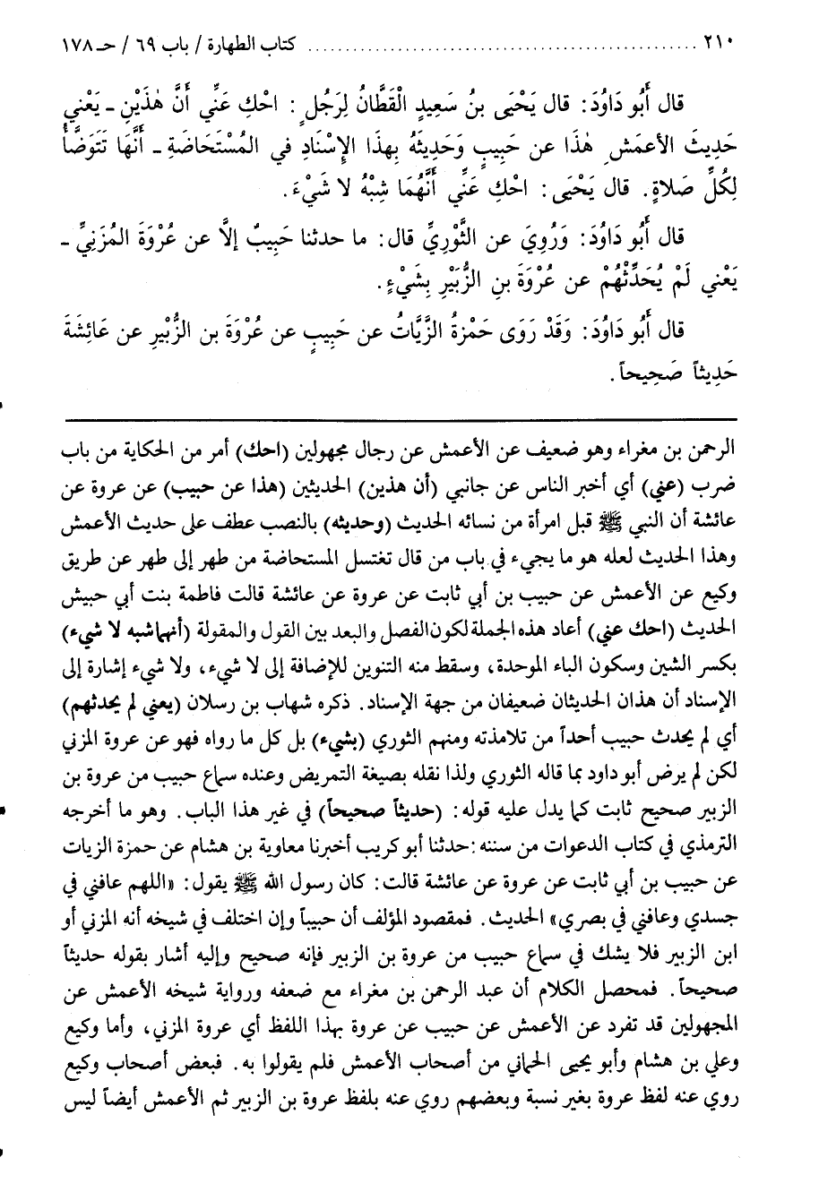 ذَكَرَهُ شِهَابُ بْنُ رَسْلَانَ (يَعْنِي لَمْ يُحَدِّثْهُمْ) أَيْ لَمْ يُحَدِّثْ حَبِيبٌ أَحَدًا مِنْ تَلَامِذَتِهِ وَمِنْهُمُ الثَّوْرِيُّ (بِشَيْءٍ) بَلْ كُلُّ مَا رَوَاهُ فَهُوَ عَنْ عُرْوَةَ الْمُزَنِيِّ لَكِنْ لَمْ يَرْضَ أَبُو دَاوُدَ بِمَا قَالَهُ الثَّوْرِيُّ وَلِذَا نَقَلَهُ بِصِيغَةِ التَّمْرِيضِ وَعِنْدَهُ سَمَاعُ حَبِيبٍ مِنْ عُرْوَةَ بْنِ الزُّبَيْرِ صَحِيحٌ ثَابِتٌ كَمَا يَدُلُّ عَلَيْهِ قَوْلُهُ (حَدِيثًا صَحِيحًا) فِي غَيْرِ هَذَا الْبَابِ