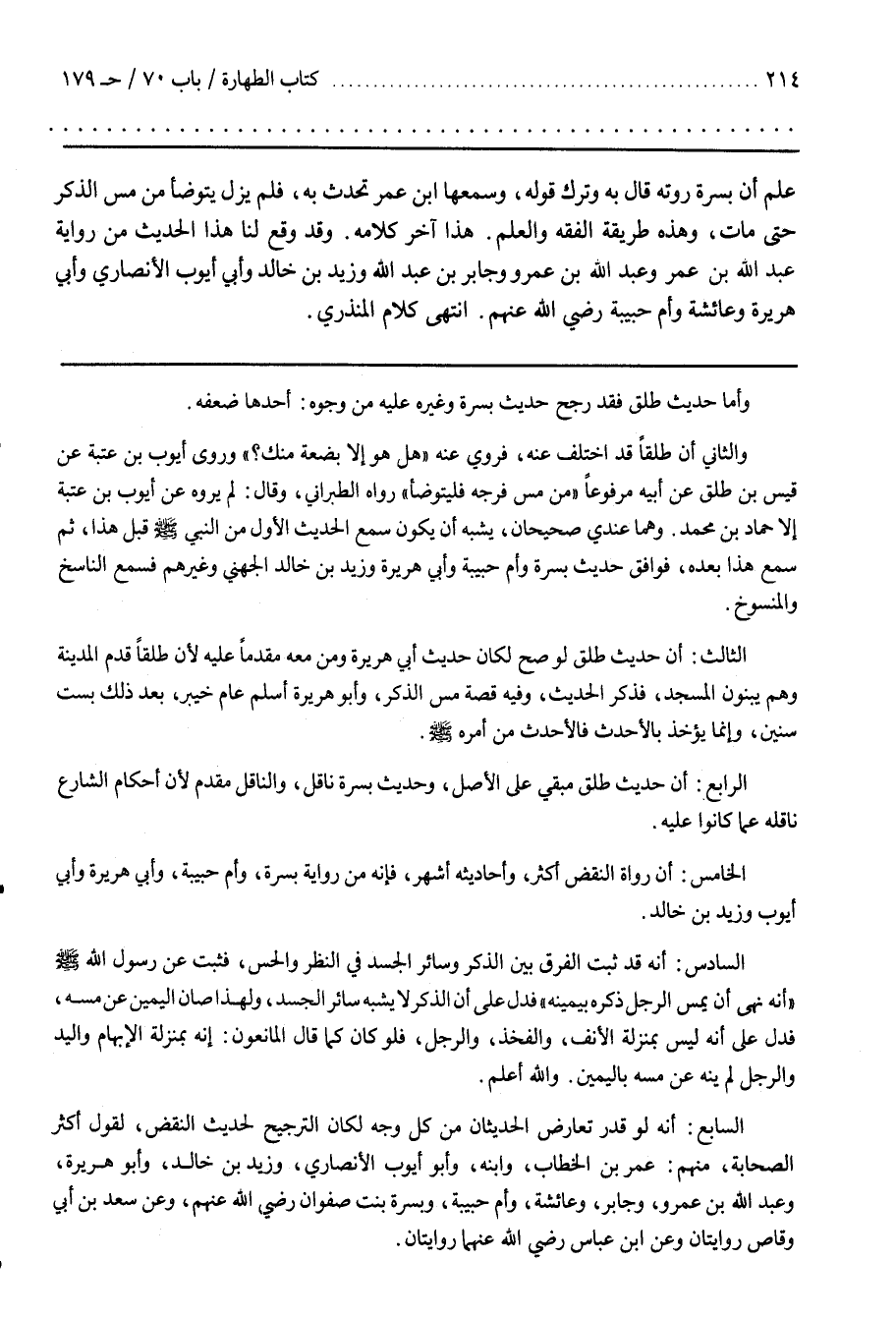 ــــــــــــQوَأَمَّا حَدِيث طَلْقٍ فَقَدْ رَجَحَ حَدِيث بُسْرَةَ وَغَيْره عَلَيْهِ مِنْ وُجُوه أَحَدهَا ضَعْفه