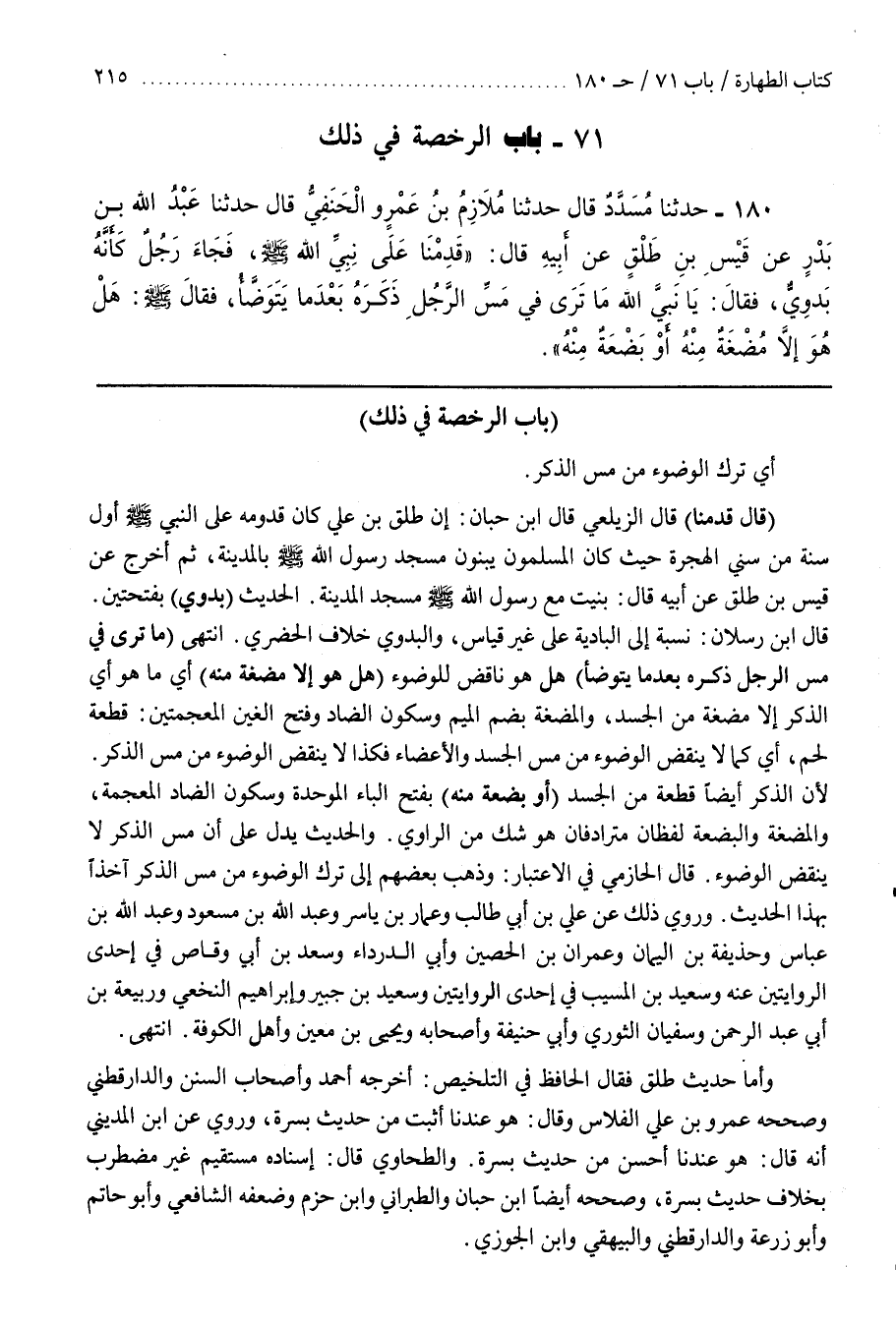 [182] 71 بَاب الرُّخْصَةِ فِي ذَلِكَ أَيْ تَرْكُ الْوُضُوءَ مِنْ مَسِّ الذَّكَرِ