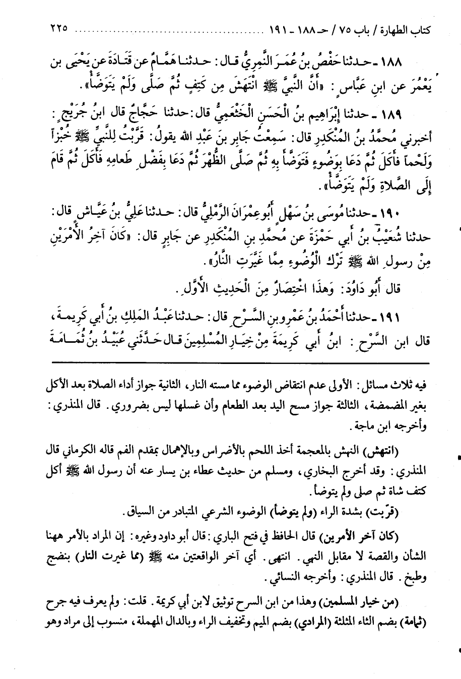 [190] (انْتَهَشَ) النَّهْشُ بِالْمُعْجَمَةِ أَخْذُ اللَّحْمِ بِالْأَضْرَاسِ وَبِالْإِهْمَالِ بِمُقَدَّمِ الْفَمِ قَالَهُ الْكِرْمَانِيُّ قَالَ الْمُنْذِرِيُّ وَقَدْ أَخْرَجَ الْبُخَارِيُّ وَمُسْلِمٌ مِنْ حَدِيثِ عَطَاءِ بْنِ يَسَارٍ عَنْهُ أَنَّ رَسُولَ اللَّهِ صَلَّى اللَّهُ عَلَيْهِ وَسَلَّمَ أَكَلَ كَتِفِ شَاةٍ ثُمَّ صَلَّى وَلَمْ يَتَوَضَّأْ