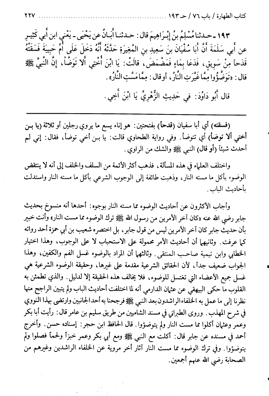 وَأَجَابَ الْأَكْثَرُونَ عَنْ أَحَادِيثِ الْوُضُوءِ مِمَّا مَسَّتْهُ النَّارُ بِوُجُوهٍ أَحَدُهَا أَنَّهُ مَنْسُوخٌ بِحَدِيثِ جَابِرٍ رَضِيَ اللَّهُ عَنْهُ كَانَ آخِرُ الْأَمْرَيْنِ مِنْ رَسُولِ اللَّهِ صَلَّى اللَّهُ عَلَيْهِ وَسَلَّمَ تَرْكَ الْوُضُوءِ مِمَّا مَسَّتِ النَّارُ وَأَنْتَ خَبِيرٌ بِأَنَّ حَدِيثَ جَابِرٍ كَانَ آخِرُ الْأَمْرَيْنِ لَيْسَ مِنْ قَوْلِ جَابِرٍ بَلِ اخْتَصَرَهُ شُعَيْبُ بْنُ أَبِي حَمْزَةَ أَحَدُ رُوَاتِهِ كَمَا عَرَفْتَ