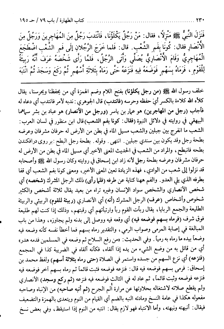 خَلْفَ رَسُولِ اللَّهِ صَلَّى اللَّهُ عَلَيْهِ وَسَلَّمَ (مَنْ رَجُلٌ يَكْلَؤُنَا) بِفَتْحِ اللَّامِ وَضَمِّ الْهَمْزَةِ أَيْ مَنْ يَحْفَظُنَا وَيَحْرُسُنَا يُقَالُ كَلَأَهُ اللَّهُ كِلَاءَةً بِالْكَسْرِ أَيْ حَفِظَهُ وَحَرَسَهُ (فَانْتُدِبَ) قَالَ الْجَوْهَرِيُّ نَدَبَهُ لِأَمْرٍ فَانْتَدَبَ أَيْ دَعَاهُ لَهُ فَأَجَابَ (رَجُلٌ مِنَ الْمُهَاجِرِينَ) هُوَ عَمَّارُ بْنُ يَاسِرٍ (وَرَجُلٌ مِنَ الْأَنْصَارِ) هُوَ عَبَّادُ بْنُ بِشْرٍ سَمَّاهُمَا الْبَيْهَقِيُّ فِي رِوَايَتِهِ فِي دَلَائِلِ النبوة (فقال كونا بفم الشعب) قال بن منظور فِي لِسَانِ الْعَرَبِ الشِّعْبُ مَا انْفَرَجَ بَيْنَ جَبَلَيْنِ وَالشِّعْبُ مَسِيلُ الْمَاءِ فِي بَطْنٍ مِنَ الْأَرْضِ لَهُ حَرْفَانِ مُشْرِفَانِ وَعَرْضُهُ بَطْحَةُ رَجُلٍ وَقَدْ يَكُونُ بَيْنَ سَنَدَيْ جَبَلَيْنِ