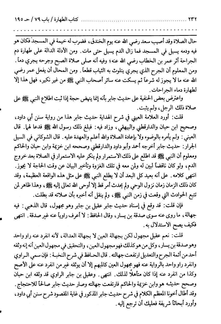 قَالَ الشَّوْكَانِيُّ فِي السَّيْلِ الْجَرَّارِ حَدِيثُ جَابِرٍ أَخْرَجَهُ أحمد وأبو داود والدارقطني وصححه بن خزيمة وبن حِبَّانَ وَالْحَاكِمُ وَمَعْلُومٌ أَنَّ النَّبِيَّ صَلَّى اللَّهُ عَلَيْهِ وَسَلَّمَ قَدِ اطَّلَعَ عَلَى ذَلِكَ الِاسْتِمْرَارِ وَلَمْ يُنْكِرْ عَلَيْهِ الِاسْتِمْرَارُ فِي الصَّلَاةِ بَعْدَ خُرُوجِ الدَّمِ وَلَوْ كَانَ الدَّمُ نَاقِضًا لَبَيَّنَ لَهُ وَلِمَنْ مَعَهُ فِي تِلْكَ الْغَزْوَةِ وَتَأْخِيرُ الْبَيَانِ عَنْ وَقْتِ الْحَاجَةِ لَا يَجُوزُ