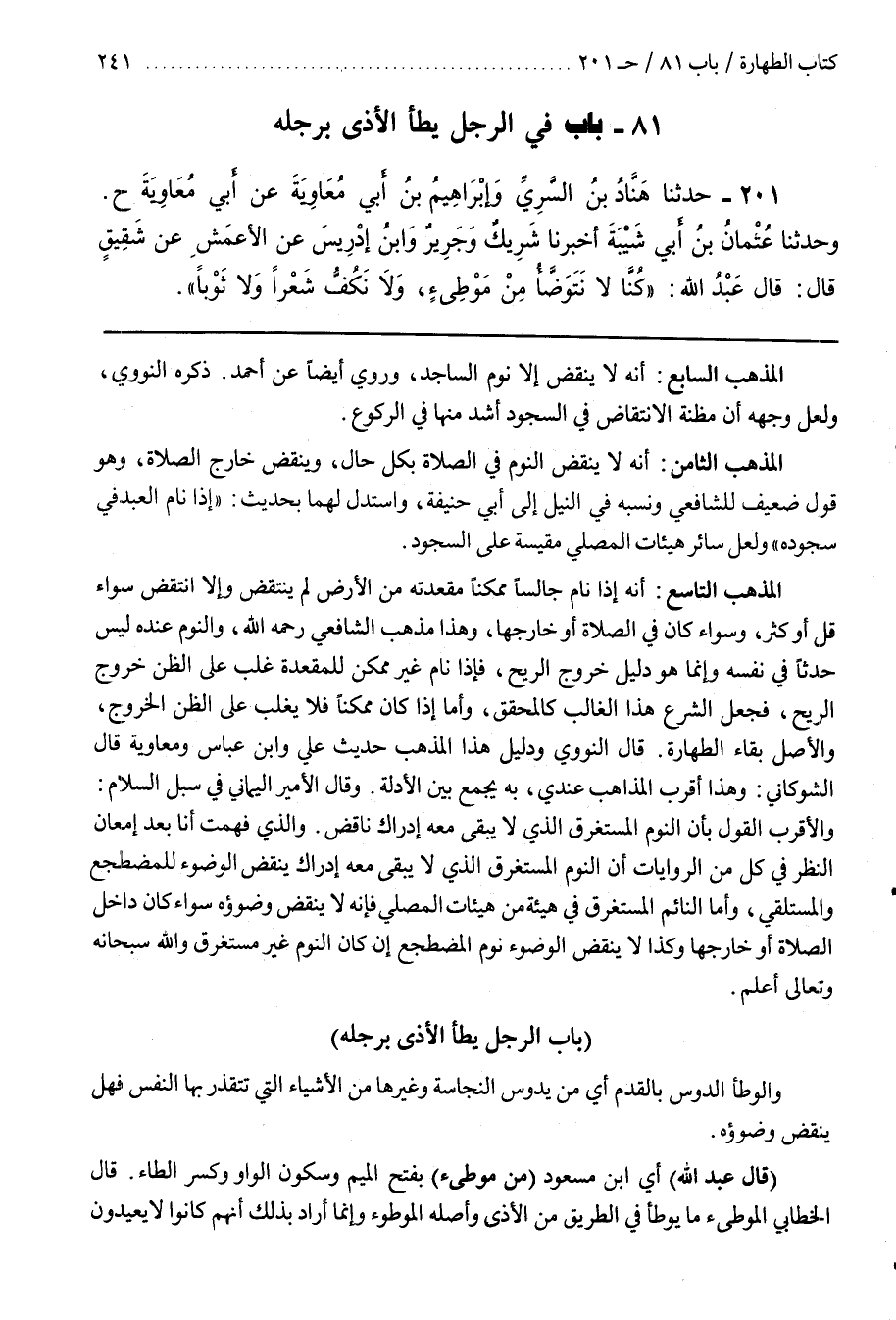 [204] والوطأ الدَّوْسُ بِالْقَدَمِ أَيْ مَنْ يَدُوسُ النَّجَاسَةَ وَغَيْرَهَا مِنَ الْأَشْيَاءِ الَّتِي تَتَقَذَّرُ بِهَا النَّفْسُ فَهَلْ ينقض وضوؤه