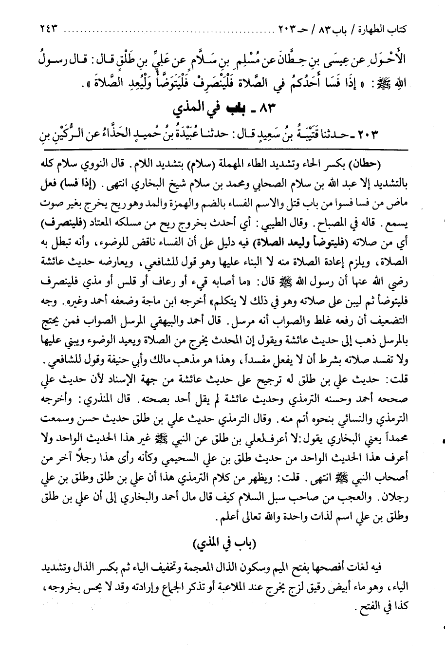 [206] فِيهِ لُغَاتُ أَفْصَحُهَا بِفَتْحِ الْمِيمِ وَسُكُونِ الذَّالِ الْمُعْجَمَةِ وَتَخْفِيفِ الْيَاءِ ثُمَّ بِكَسْرِ الذَّالِ وَتَشْدِيدِ الْيَاءِ وَهُوَ مَاءٌ أَبْيَضُ رَقِيقٌ لَزِجٌ يَخْرُجُ عِنْدَ الْمُلَاعَبَةِ أَوْ تَذَكُّرِ الْجِمَاعِ وَإِرَادَتِهِ وَقَدْ لَا يُحَسُّ بِخُرُوجِهِ كَذَا فِي الفتح