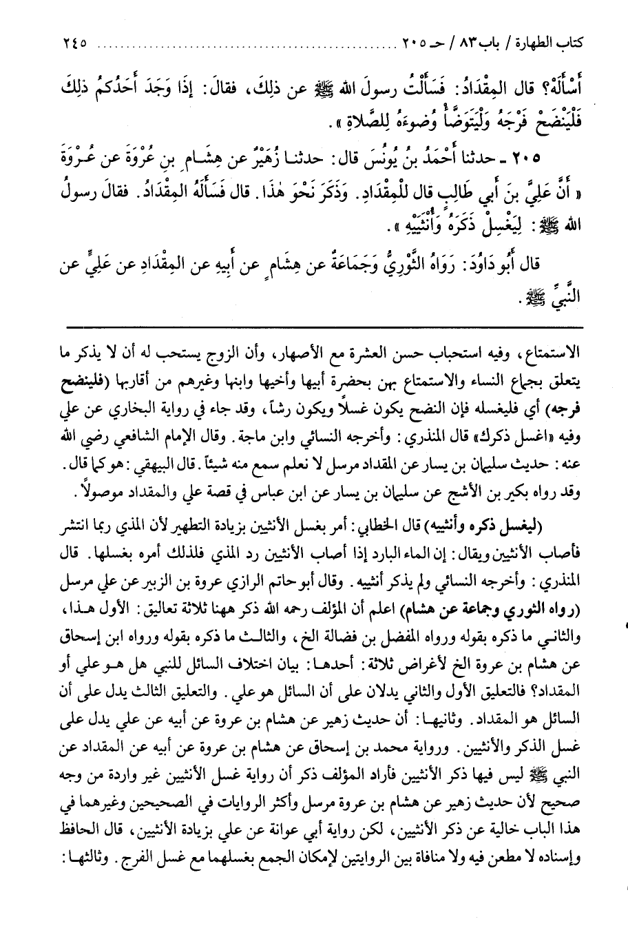 وَرِوَايَةُ مُحَمَّدِ بْنِ إِسْحَاقَ عَنْ هِشَامِ بْنِ عُرْوَةَ عَنْ أَبِيهِ عَنِ الْمِقْدَادِ عَنِ النَّبِيِّ صَلَّى اللَّهُ عَلَيْهِ وَسَلَّمَ لَيْسَ فِيهَا ذِكْرُ الْأُنْثَيَيْنِ فَأَرَادَ الْمُؤَلِّفُ ذِكْرَ أَنَّ رِوَايَةَ غَسْلِ الْأُنْثَيَيْنِ غَيْرُ وَارِدَةٍ مِنْ وَجْهٍ صَحِيحٍ لِأَنَّ حَدِيثَ زُهَيْرٍ عَنْ هِشَامِ بْنِ عُرْوَةَ مُرْسَلٌ وَأَكْثَرُ الرِّوَايَاتِ فِي الصَّحِيحَيْنِ وَغَيْرِهِمَا فِي هَذَا الْبَابِ خَالِيَةٌ عَنْ ذِكْرِ الْأُنْثَيَيْنِ لَكِنْ رِوَايَةُ أَبِي عَوَانَةَ عَنْ عَلِيٍّ بِزِيَادَةِ الْأُنْثَيَيْنِ قَالَ الْحَافِظُ وَإِسْنَادُهُ لَا مَطْعَنَ فِيهِ وَلَا مُنَافَاةَ بَيْنَ الرِّوَايَتَيْنِ لِإِمْكَانِ الْجَمْعِ بِغَسْلِهِمَا مَعَ غَسْلِ الفرج